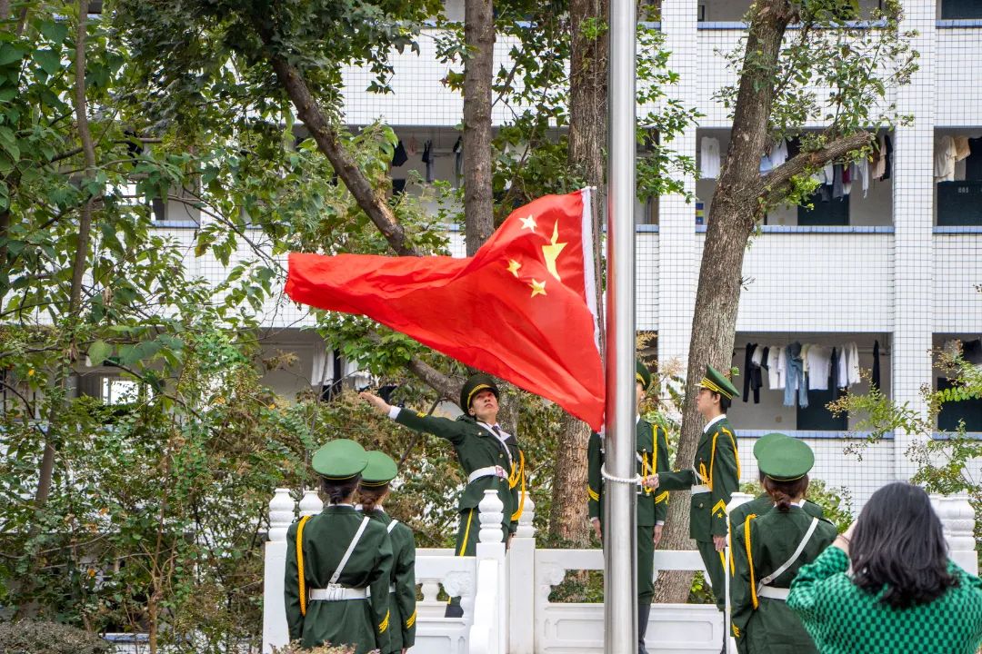 在庄严雄浑的国歌声中,典礼正式拉开帷幕,鲜艳的五星红旗冉冉升起,全体师生起立面向国旗行注目礼,身姿挺拔,神色严肃,开启青春新章。