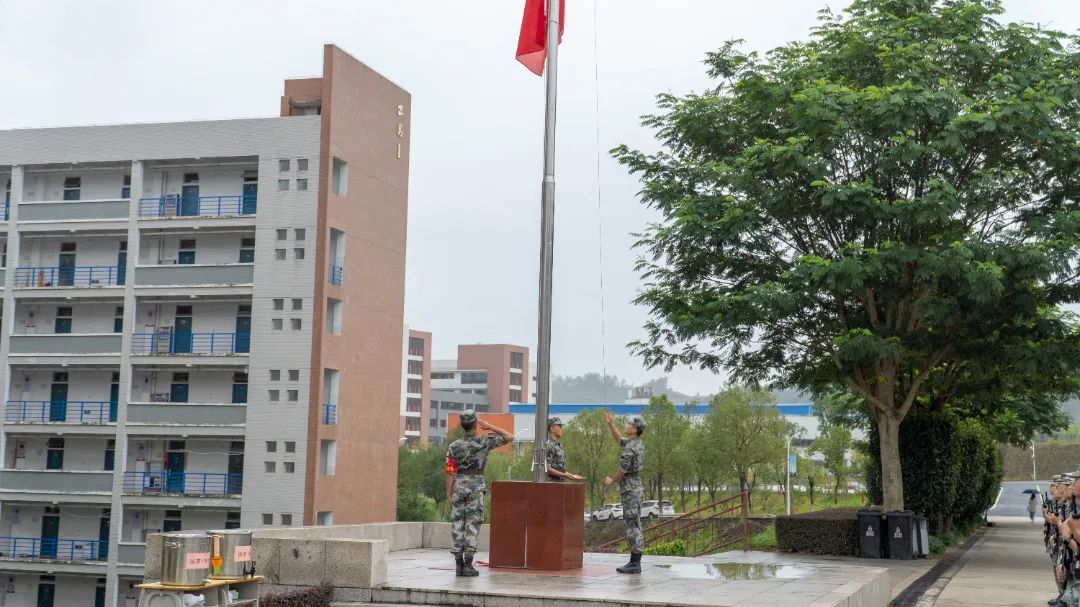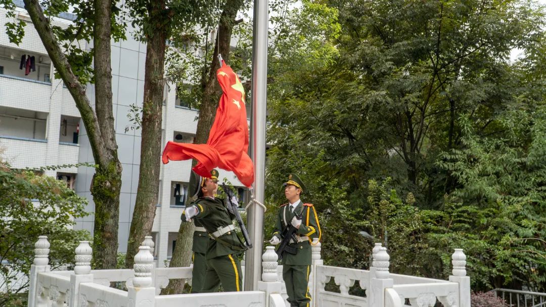 在庄严雄浑的国歌声中,典礼正式拉开帷幕,鲜艳的五星红旗冉冉升起,全体师生起立面向国旗行注目礼,身姿挺拔,神色严肃,开启青春新章。
