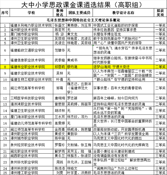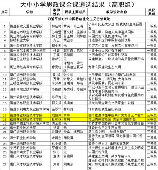 本网讯为深入学习宣传贯彻党的二十大精神,贯彻落实习近平总书记在学校思想政治理论课教师座谈会上的重要讲话精神和关于思政课建设的重要指示批示精神,马克思主义学院积极响应“讲好中国故事 上好思政课程”创优攻坚集体行动,组织思政课教学展示活动,在2023年福建省大中小学思政课金课遴选中获得二等奖1项、三等奖2项。