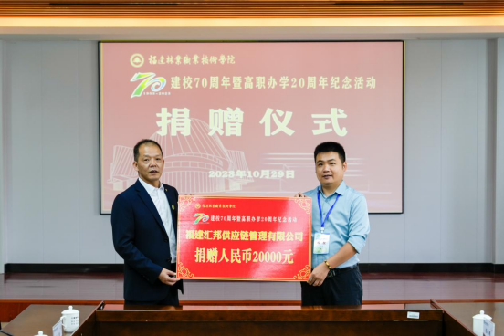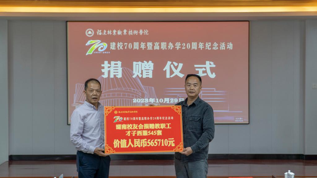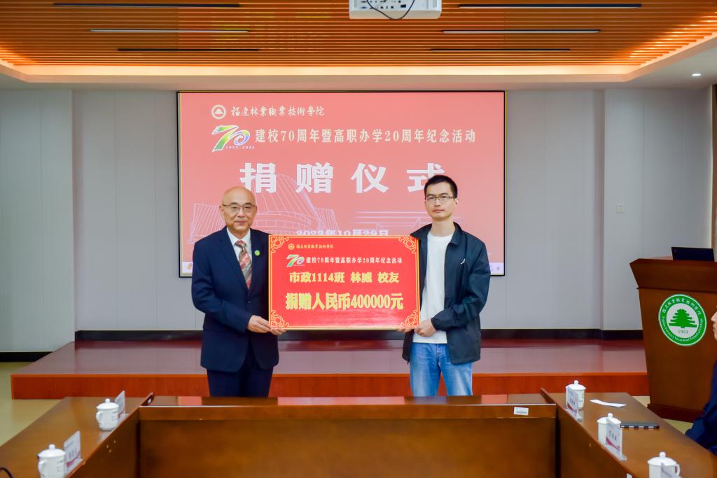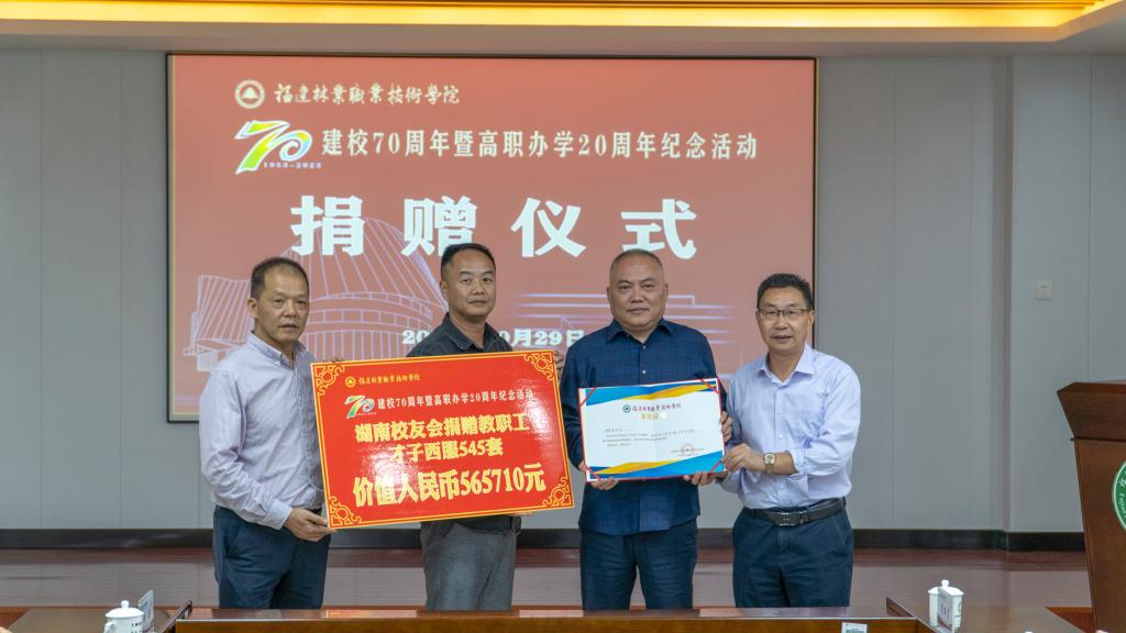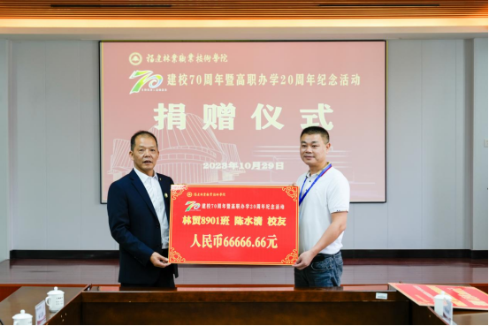 本网讯 饮水思源不忘初心,真情回馈携手同行。10月29日,在喜迎福建林业职业技术学院建校70周年暨高职办学20周年华诞之际,学院在江南校区行政楼6楼会议室举行校友企业捐赠仪式。