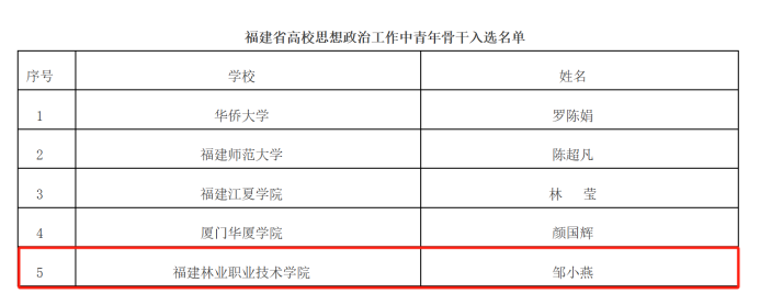 本网讯 近日,中共福建省委教育工委公布了2023年福建省高校思想政治工作质量提升综合改革与精品建设项目入选名单。我院黄晓宁老师主持的《传统文化润人心 培根铸魂育新人》入选福建省高校思想政治工作精品项目,邹小燕老师入选福建省高校思想政治工作中青年骨干。