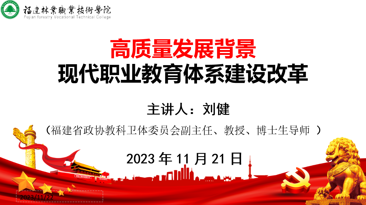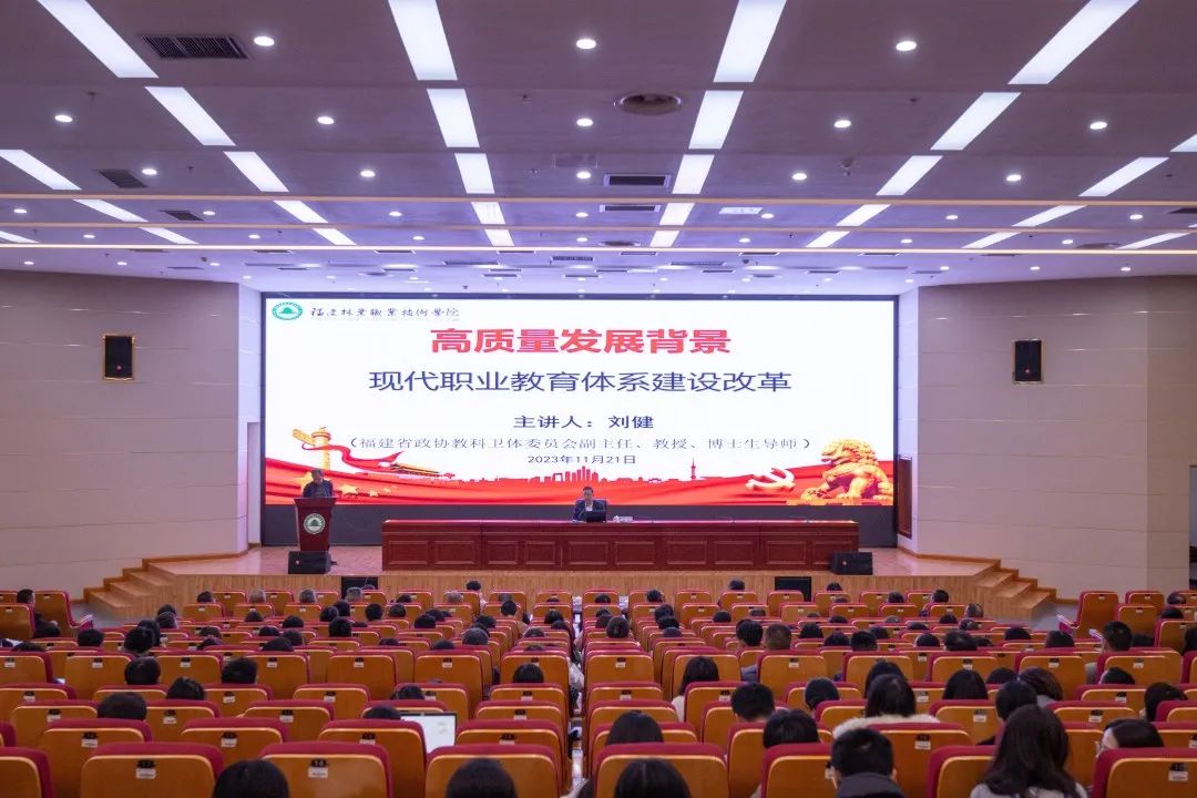 本网讯为进一步深入学习贯彻党的二十大精神和习近平总书记关于职业教育的重要指示,落实国家职业教育高质量发展新要求,进一步推动现代职教体系建设改革和“双高校”建设工作,11月21日下午,学院在江南校区图书馆报告厅举办天麟大讲堂,特邀福建省政协教科卫体委员会副主任、教授、博士生导师刘健作《高质量发展背景现代职业教育体系建设改革》专题报告。院党委副书记、院长刘文开主持讲座。学院有关院领导、部门负责人、专兼职教师等参加讲座。