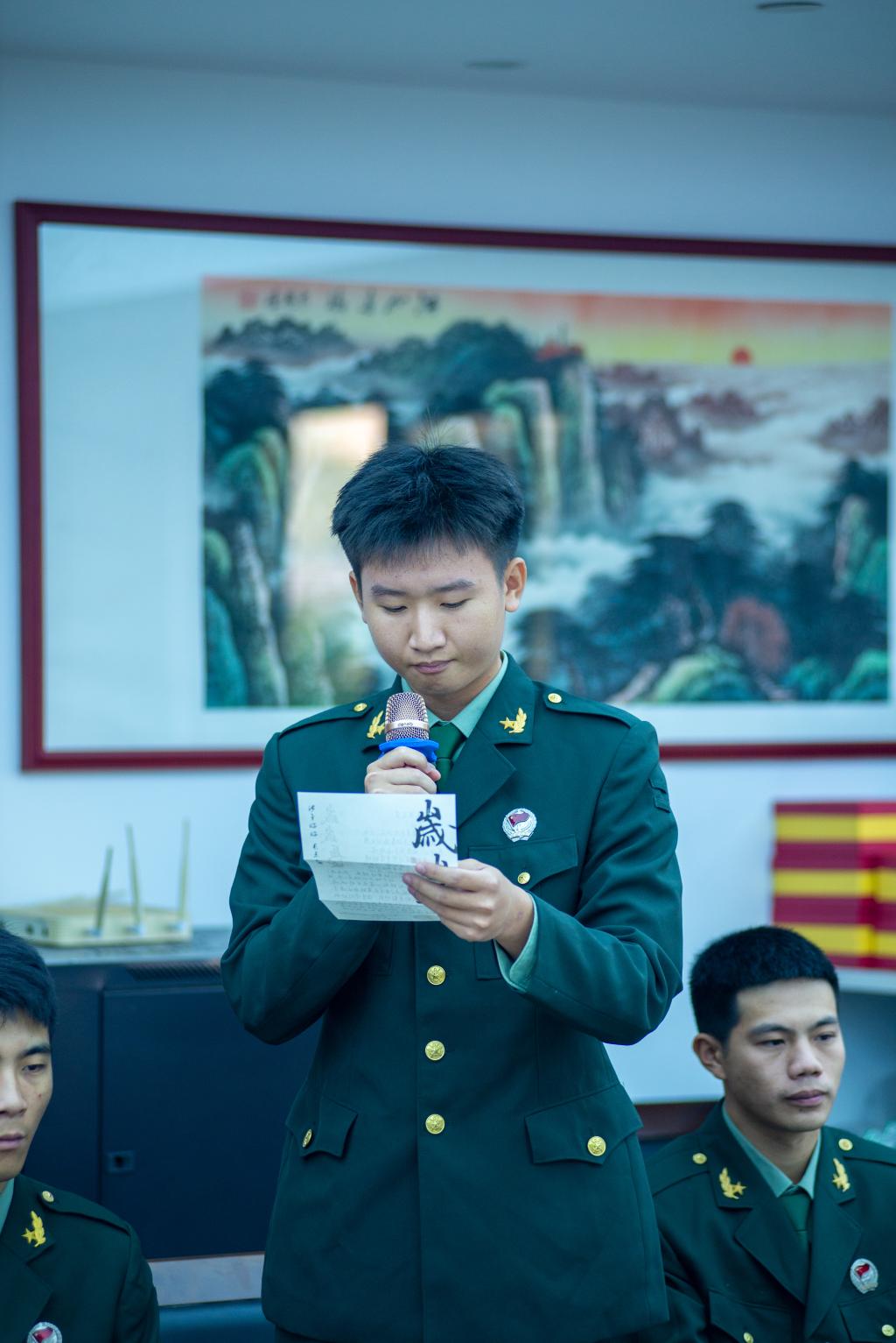 2.信息工程系学生第一党支部曹子涵:这是一次难忘的经历,在与老兵前辈们的交流当中,我感受到了他们对国家深深的热爱和对革命事业的坚定信念,他们用朴素深情的话语讲述他们曾经的英勇事迹,他们经历了不平凡的年代,为国家付出了宝贵的青春,让我深深明白了"家国天下"的重要性。而老兵前辈们对我们新时代青年的建议就是让我们好好学习,这样才能更好地报效国家。在他们的身上,我感受到了他们的伟大,懂得了什么是真正的英雄。
