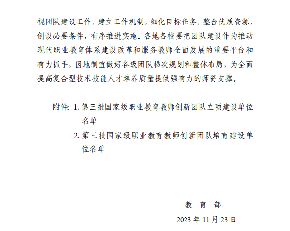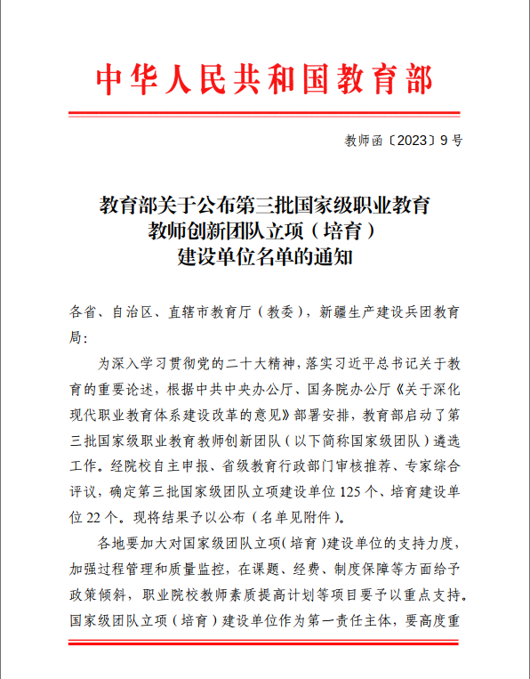 自教育部启动实施全国职业院校教师教学创新团队建设项目以来,学院高度重视教师创新团队建设工作,认真统筹落实培育建设的各项指标任务,推进重点专业教师创新团队高标准建设。