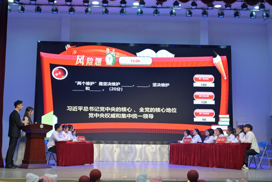 场上,参赛选手们各个精神饱满、热情高涨,赛场气氛紧张激烈,在必答题环节,各队凭借丰富的党建知识积累均拿到了满分,在抢答环节中,各队你追我赶,难分伯仲,在风险题环节中,三支队伍机智沉着地答题,当支部团队选择高分值题时,更是让现场的观众紧紧捏了一把汗,将党建知识竞赛活动推向了高潮。场下智囊团在本支部答题遇到瓶颈时的及时助力,更是获得了台上台下的一阵阵掌声。
