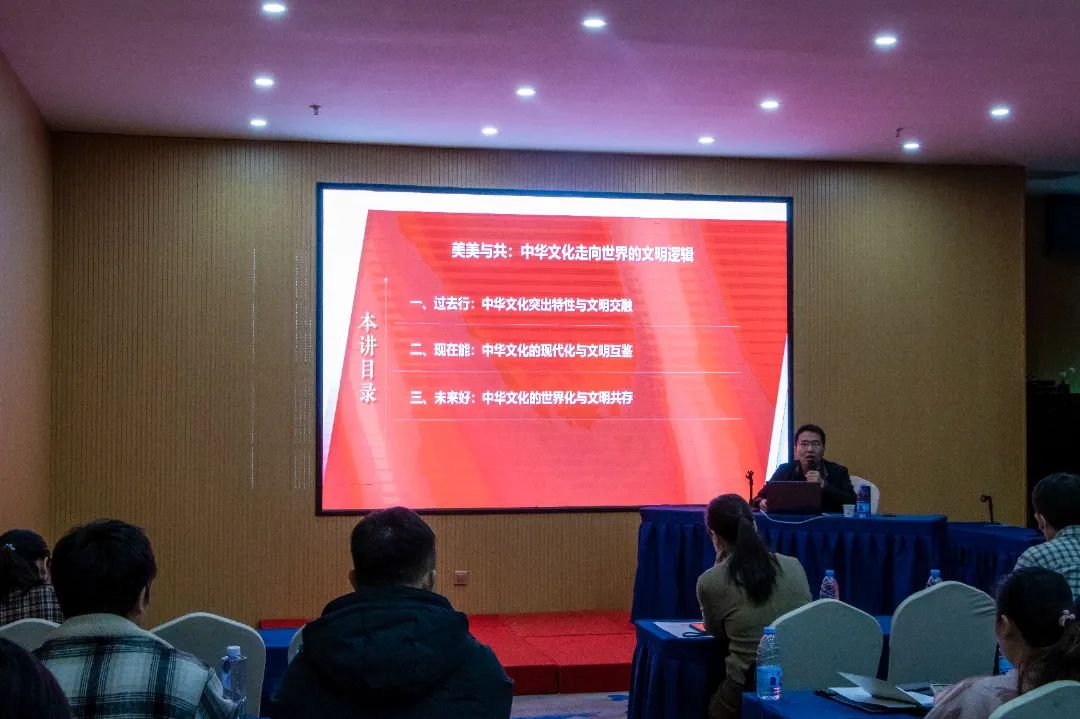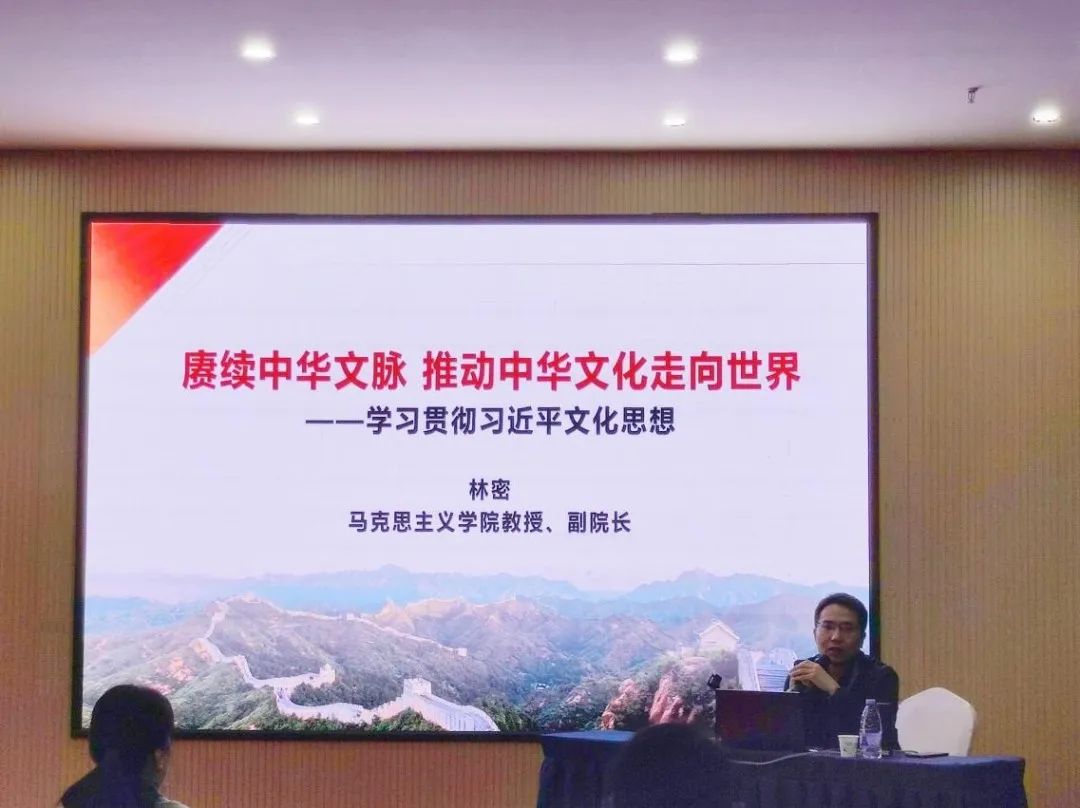 研学班邀请了厦门大学马克思主义学院副院长林密教授为全体教师作“赓续中华文明,推动中华文化走向世界——学习贯彻习近平文化思想”专题授课。授课中,林密教授以深厚的理论功底和广阔的国际视野,生动有趣的案例和形式多样的方式讲述了中国文化过去行、现在能、未来好的深刻内涵,帮助教师们开阔了思路、加深了对中华文化的理解,进一步增强了文化自信与文化自觉。