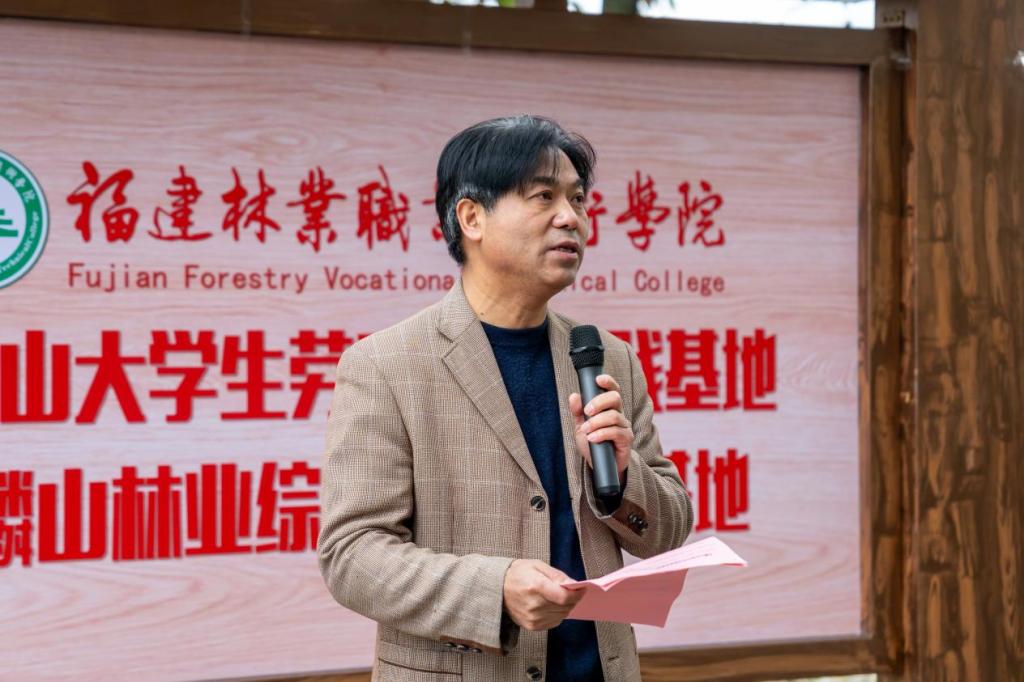 本网讯为全面贯彻《关于全面加强新时代大中小学劳动教育的意见》,落实“德智体美劳”五育并举,培养学生树立正确的劳动观念,练就过硬的劳动技能,12月14日上午,福建林业职业技术学院举行天麟山大学生劳动教育实践基地暨天麟山林业综合教学实训基地揭牌仪式。院党委副书记严绍裕、林学系副主任傅成杰、经管系学生科科长兼团总支书记王昉、经管系教学科科长宋李玉以及经管系师生代表参加本次活动,活动由王昉科长主持。