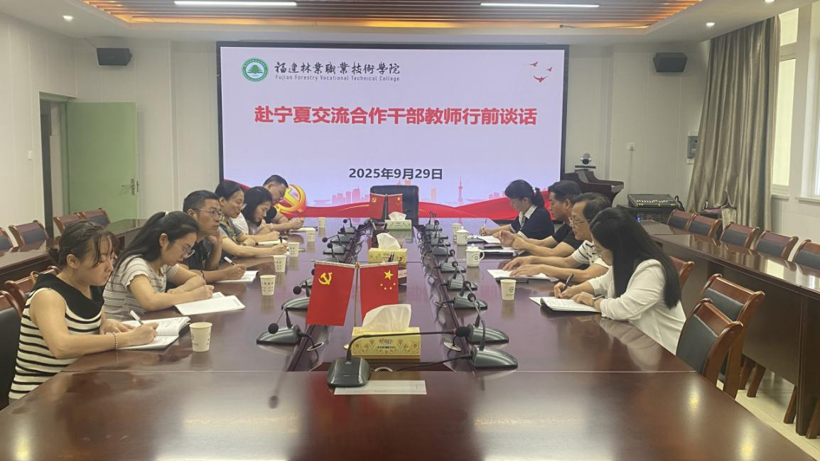 本网讯 为深入推进东西部协作与定点帮扶工作,贯彻落实党中央关于推动区域协调发展、促进共同富裕的决策部署,我院与宁夏葡萄酒与防沙治沙职业技术学院多年来持续开展合作,共谋发展。今年,学院选派6名干部教师赴宁夏开展校际交流合作。为确保交流任务顺利实施,9月29日,学院组织召开闽宁校际合作交流行前会议。院党委副书记严绍裕、副院长黄晖,以及组织部(统战部)、人事处(教师工作部)负责人与全体选派人员共同参会。