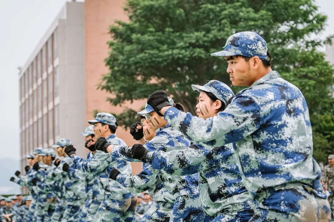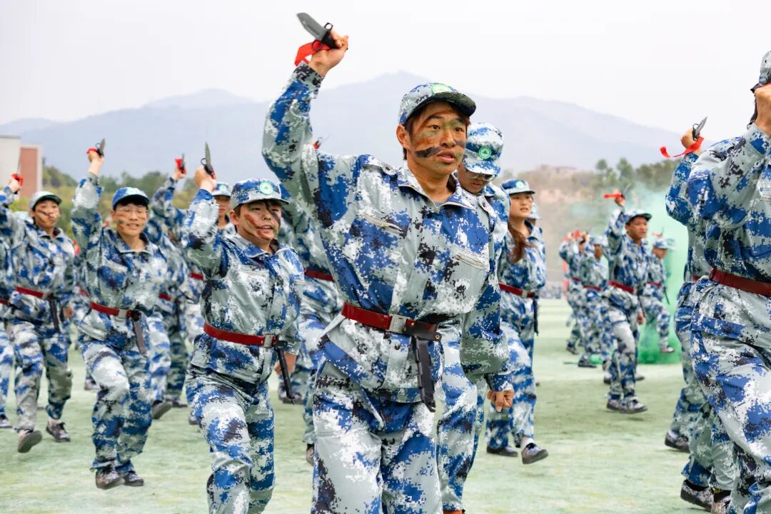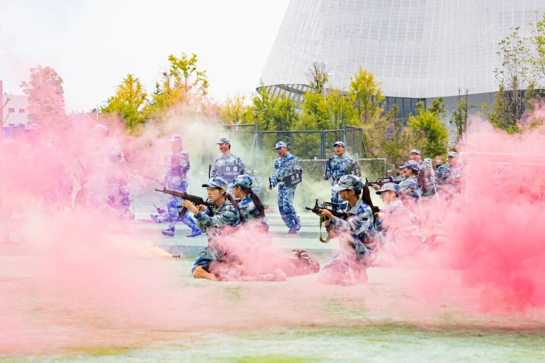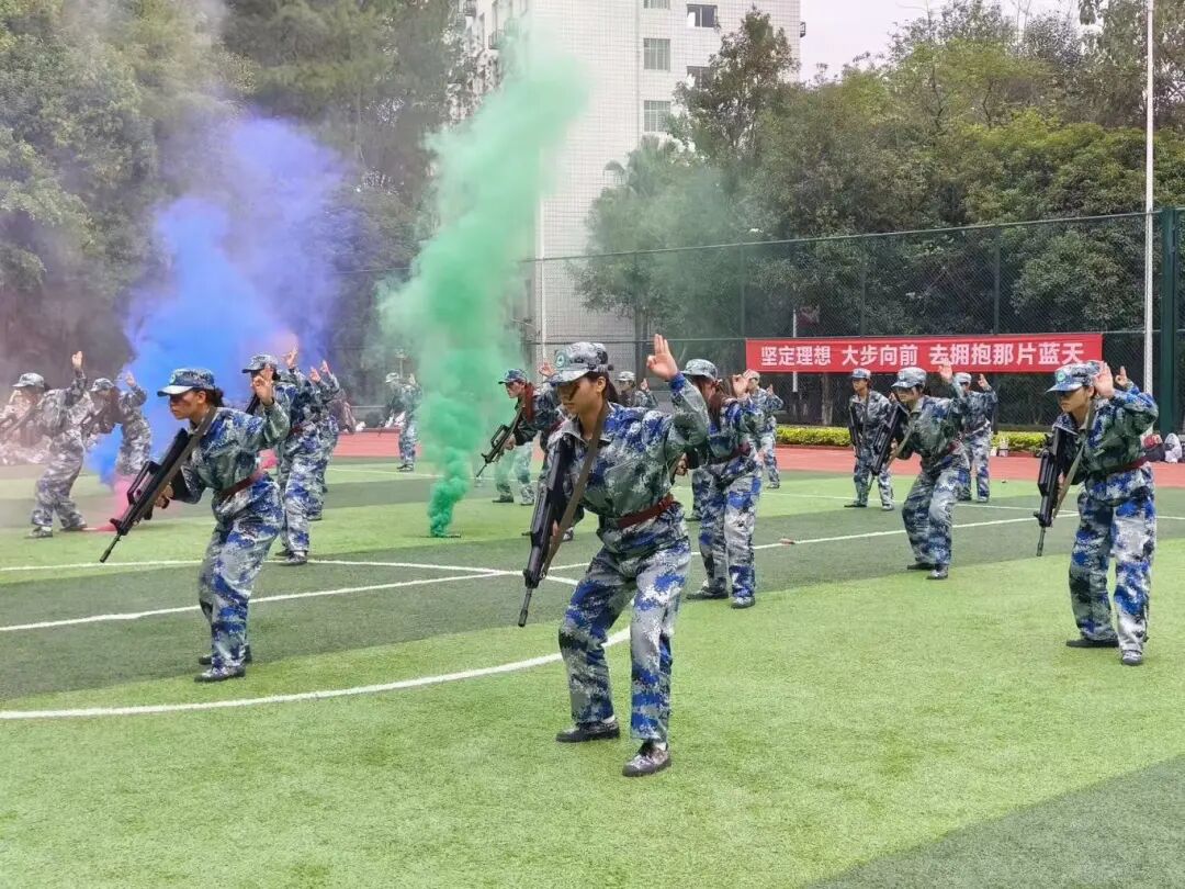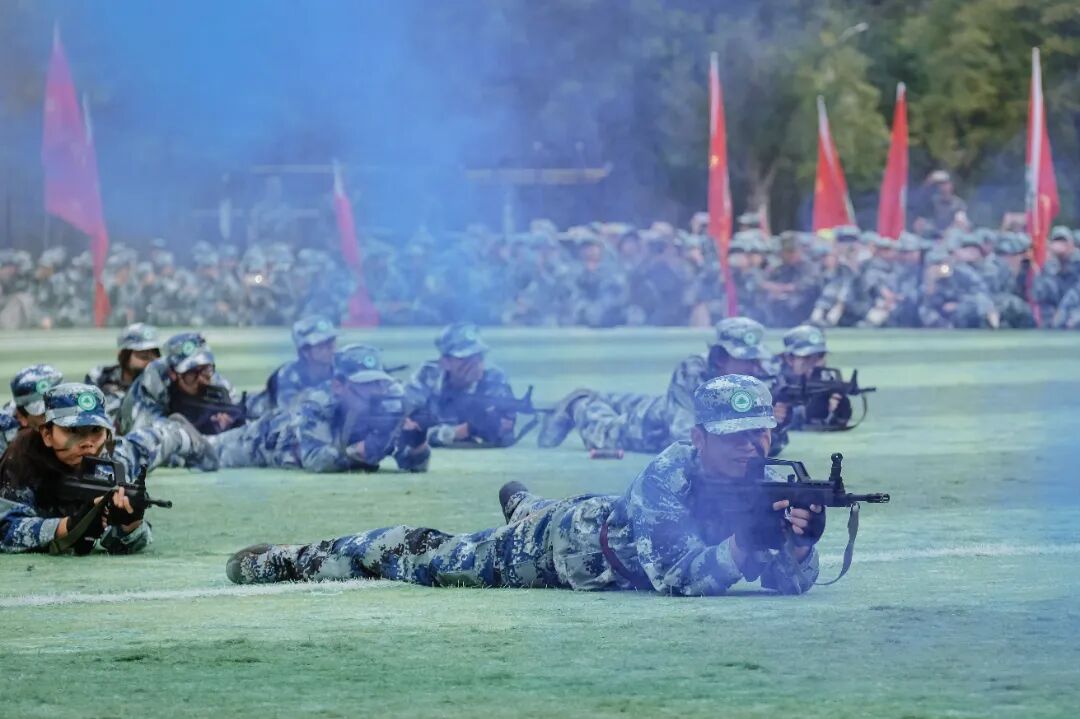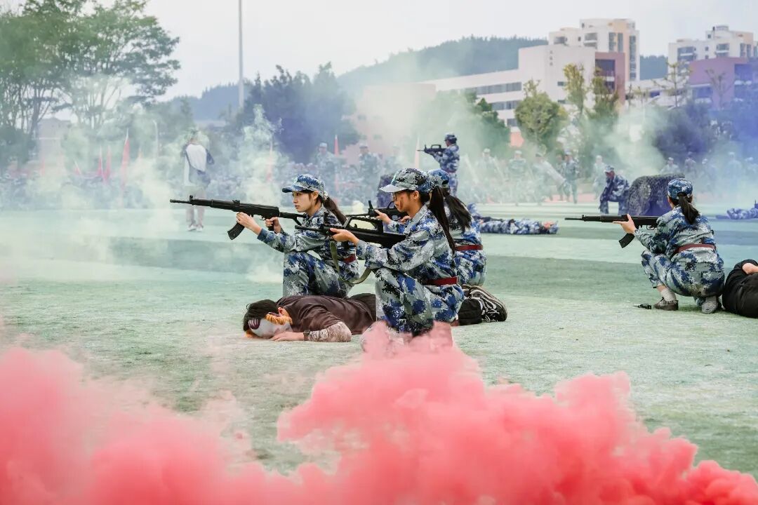 特色军事科目表演环节将现场气氛推向高潮。军体拳方阵拳脚生风,招式刚劲有力;匕首操表演动作整齐划一,突刺迅猛,尽显巾帼风采与飒爽英姿;刺杀操方阵吼声震天,一攻一防间展现出不屈的战斗意志;战术表演模拟战场环境,队员们协同配合,动作干脆利落,硝烟弥漫中彰显了坚毅果敢的拼搏精神,赢得了现场师生的阵阵掌声。