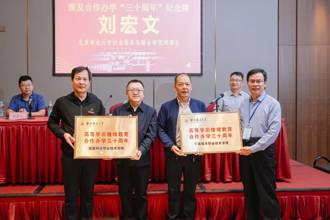 会上举行了合作办学三十周年纪念牌颁发仪式。北京林业大学副校长程武和社会服务与综合研究部部长刘宏文为福建林业职业技术学院、宁波城市职业技术学院颁发合作办学三十周年纪念牌,表彰两校三十年来在校外教学点合作中风雨同舟、携手育人所作出的重要贡献。