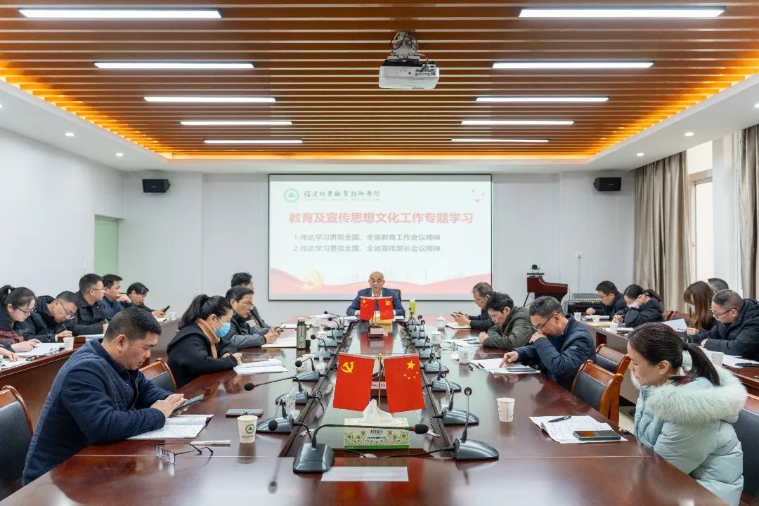 万泉书记传达学习全国、全省宣传部长会议精神。党委副书记严绍裕在发言中指出,要深入学习贯彻习近平文化思想,认真落实全国、全省宣传部长会议精神,坚决守好意识形态阵地,推动学院宣传思想文化工作焕发新气象、开创新局面。一要学深悟透习近平文化思想。加强系统学习、深入研究和实践落实,使之贯穿工作全过程各方面,守正创新做好宣传思想文化工作。二要加强党的全面领导。坚持党的文化领导权,巩固拓展学院主题教育成果,深化“深学争优、敢为争先、实干争效”行动,为推进中国式现代化福建实践贡献林职力量。三要巩固壮大主流思想舆论。按照会议部署,对照学院工作要点,紧扣中华人民共和国成立75周年、习近平总书记亲自擘画“机制活、产业优、百姓富、生态美”新福建宏伟蓝图10周年等重要节点,精心谋划推进理论舆论、内宣外宣、文化文艺、网上网下等各项工作,不断开创学院宣传思想文化工作新局面。