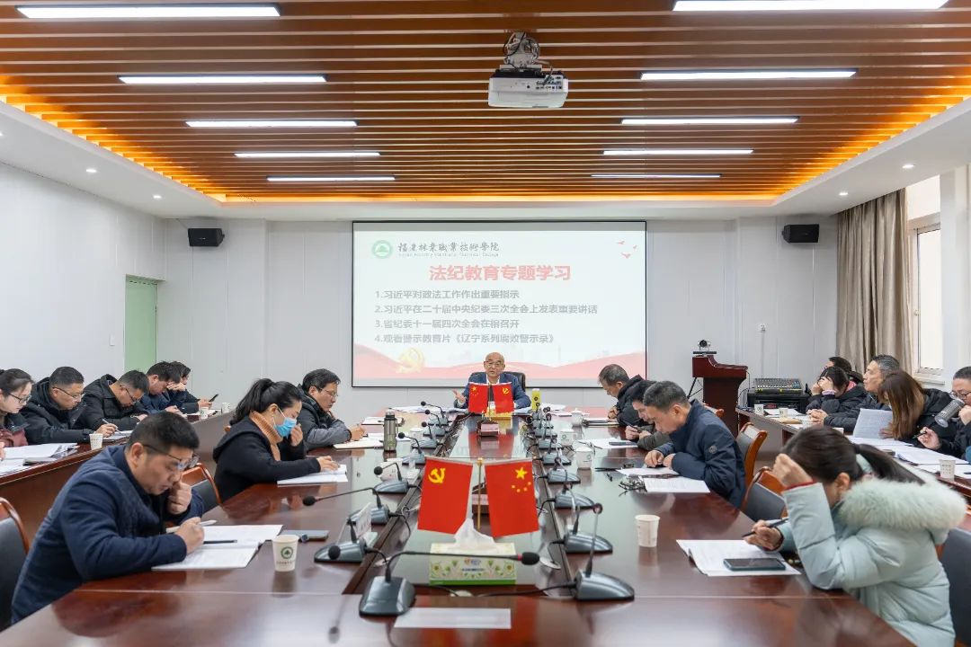 会议开展法纪教育专题学习。万泉书记领学习近平对政法工作的重要指示、习近平在二十届中央纪委三次全会上发表重要讲话、省纪委十一届四次全会精神,观看警示教育片《辽宁系列腐败警示录》。纪委办主任谢福荣在发言中指出,习近平总书记重要讲话高瞻远瞩、视野宏阔、思想深邃、内涵丰富,是新时代新征程深入推进全面从严治党、党风廉政建设和反腐败斗争的根本遵循。他指出,一要充分认识纪法工作在学院工作中的重要性,纪法关系到学校的正常运行和纪律维护,要进一步完善学院纪律建设。二要加强纪法学习和教育,树牢法治意识和规矩意识,以经常性的纪法教育促进党员干部廉洁自律和作风建设,提醒党员干部保持清醒头脑,坚守职业道德底线,为学生树立良好的榜样,提高人才培养质量。三要将纪法教育与实际工作结合,在日常工作中、具体案例中开展,强化纪律约束。四要发挥党员领导干部的榜样作用,领导干部要注意管好身边人、管好下属,及时发现苗头性、倾向性问题,早提醒、早防范。