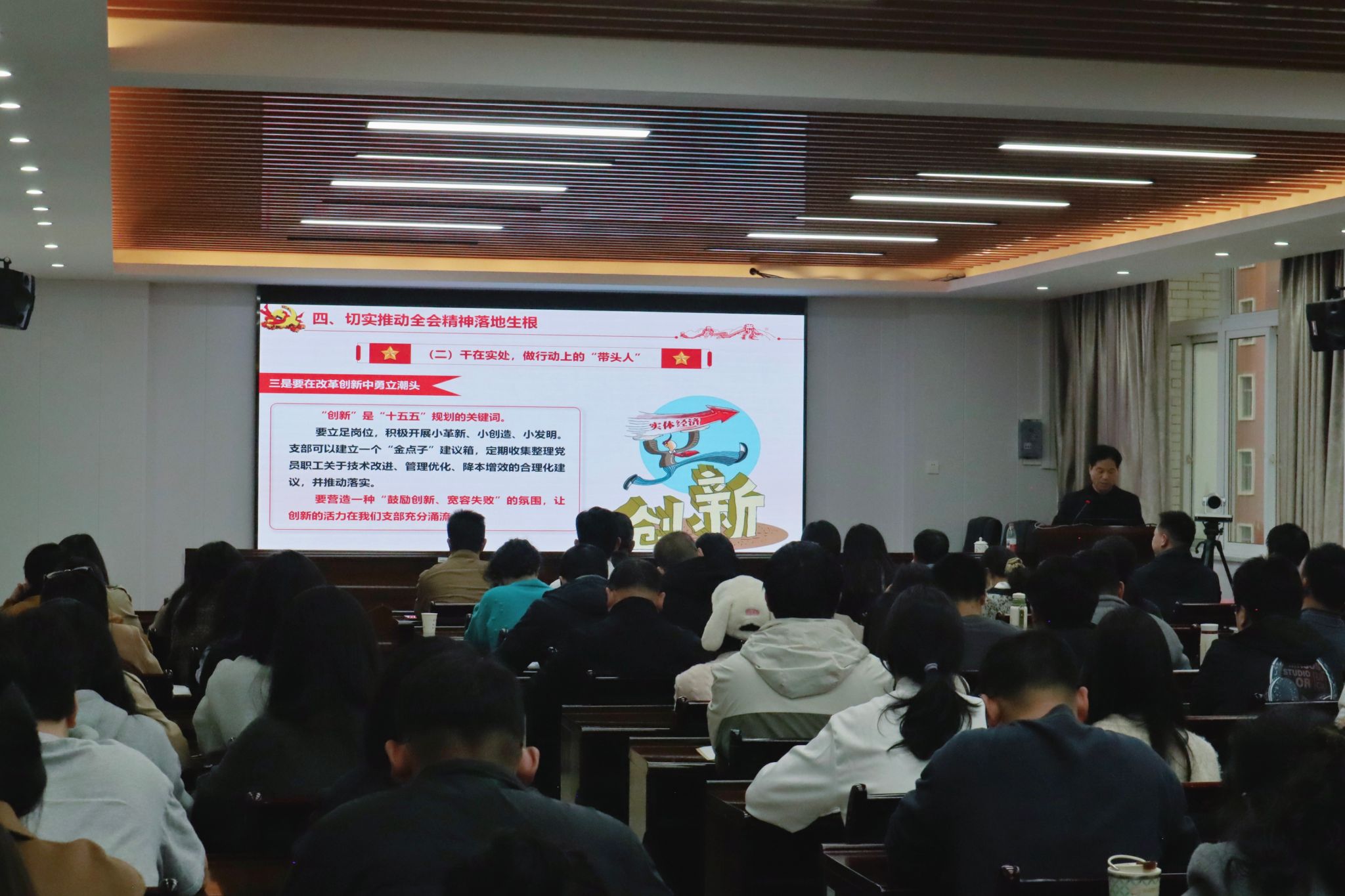 本网讯 2025年12月9日,学院党委副书记严绍裕以“深刻领会党的二十届四中全会精神 接续推进中国式现代化”为题,为师生党员讲授专题党课。组织部(统战部)党支部、宣传部党支部、学生工作部和安全保卫处联合党支部、团委党支部、马克思主义学院党支部党员,建筑工程系全体教师党员以及第58期在校学生党员参加学习。党课由建筑工程系党总支书记魏长专主持。