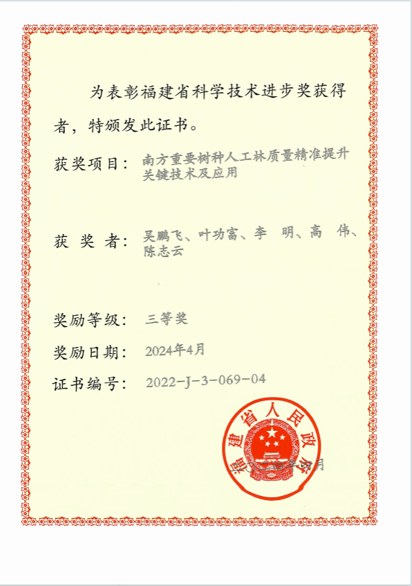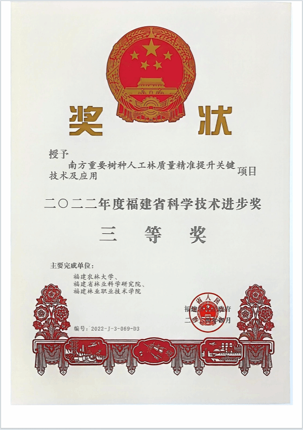 本网讯 近日,我院高伟老师参与的《渐进式海岸带森林植被高效修复成套技术》项目,荣获2024年度福建省科技进步三等奖。这是高伟老师继2022年以来第2次荣获福建省科技进步奖,体现了我院在林业特色科研领域的持续积累与进步。