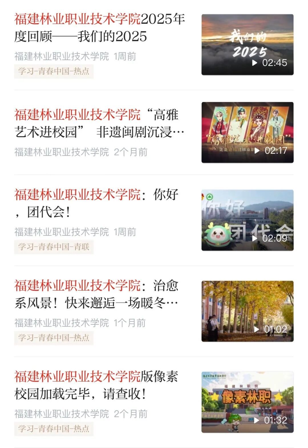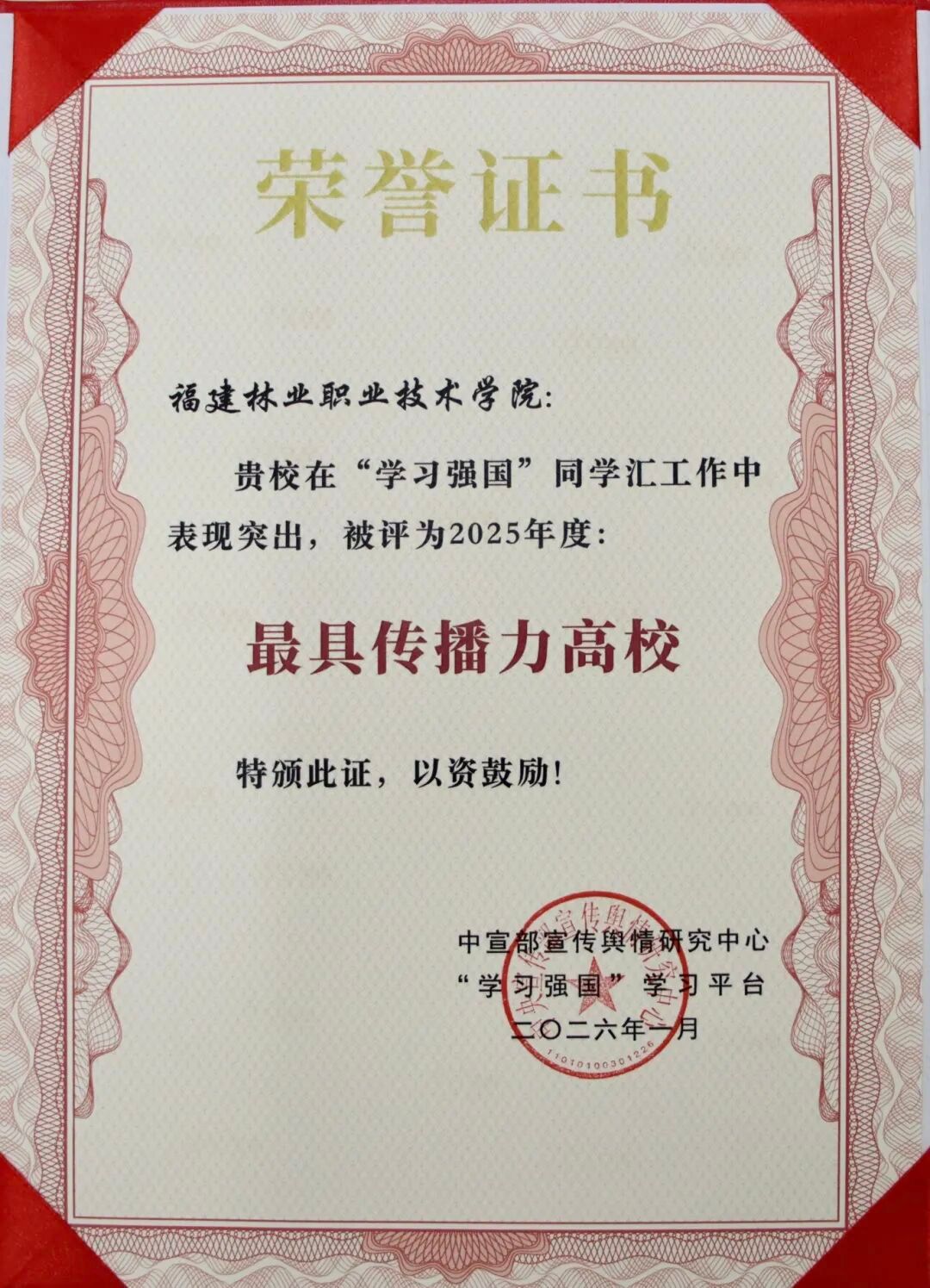 本网讯 近日,“学习强国”同学汇2025年度评选结果揭晓,福建林业职业技术学院获评“学习强国”同学汇“年度最具传播力高校”。