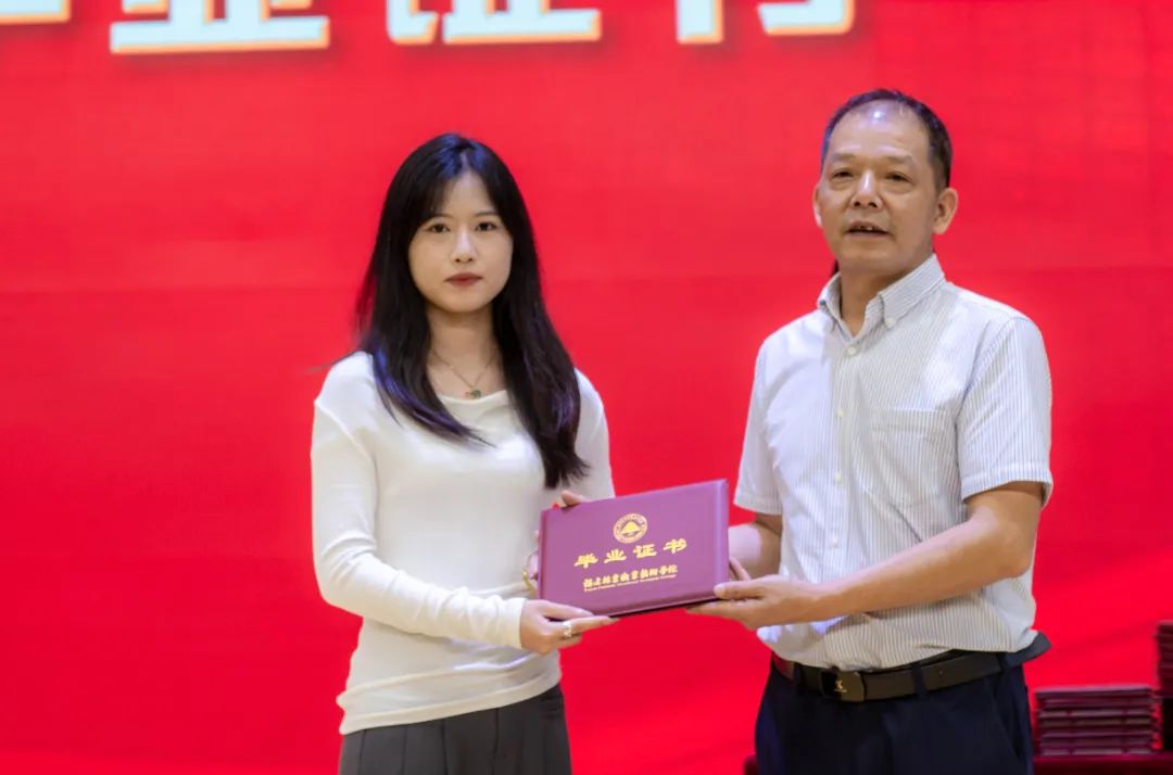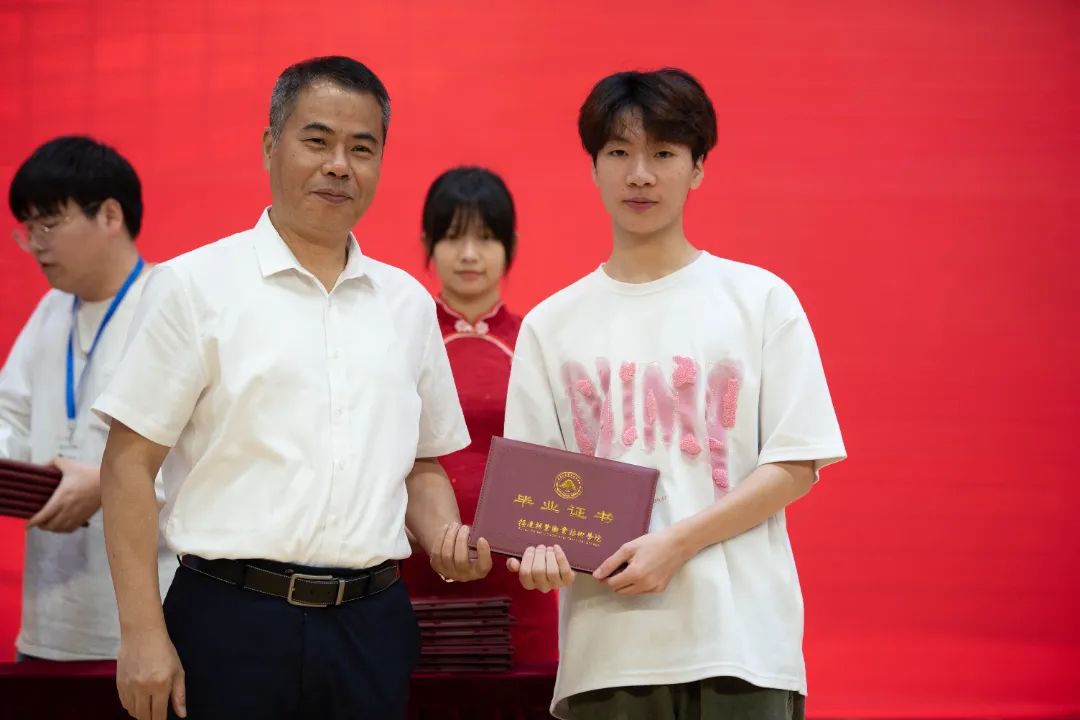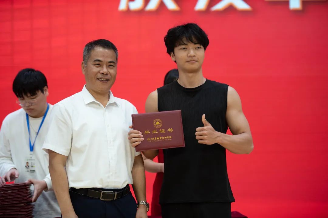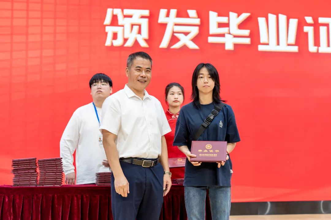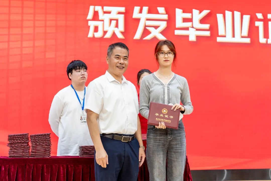 随后,陈建辉书记和刘文开院长为全体毕业生颁发毕业证书。伴随着悠扬的歌声,毕业生们意气风发地走上主席台,大家手持毕业证书与老师握手、合影留念,为自己三年大学生活划上圆满的句号。
