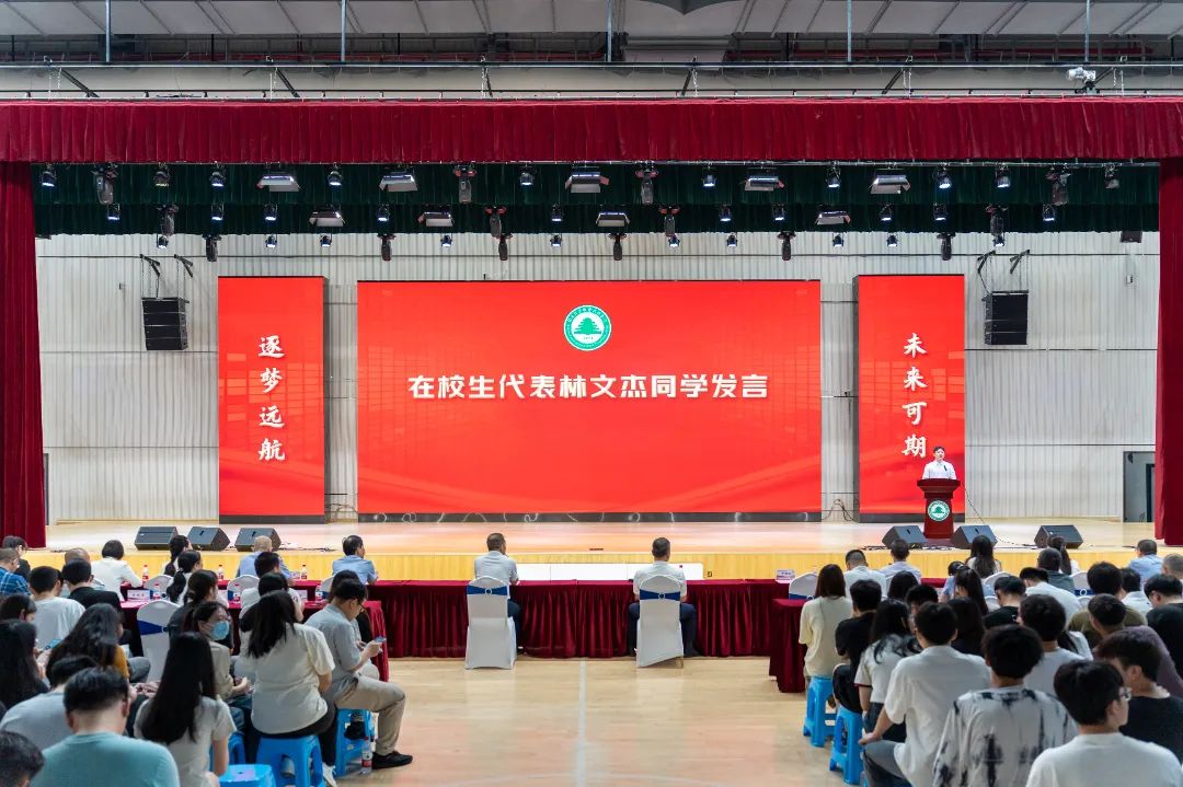 在校生代表艺术传媒系数字媒体艺术设计2201班的林文杰同学为毕业生们送上了美好的祝愿。他表示福建林业职业技术学院永远是学长学姐们最温暖的港湾,希望学长学姐们以“明思笃行、业精德厚”的校训为基石,以“敬业、吃苦、务实、进取”的天麟精神为航标,在这里放飞青春梦想,在这里开启人生首航。