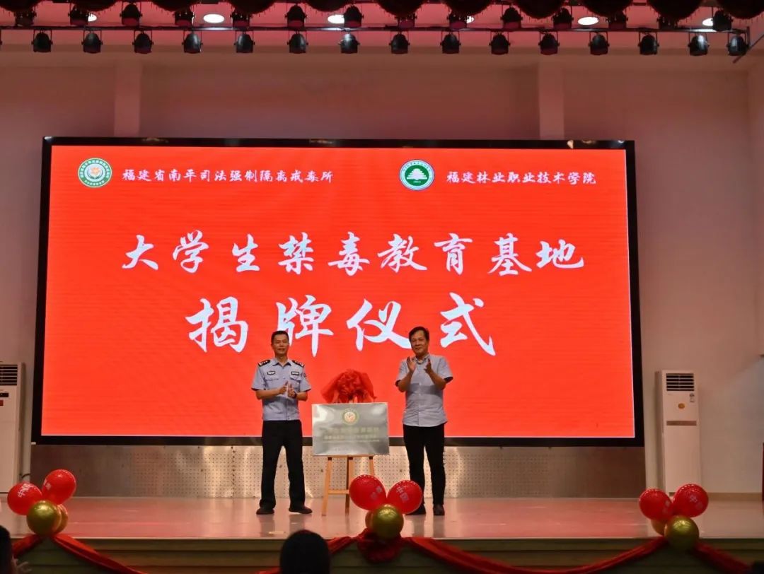 在紧张激烈的比赛和激动人心的颁奖结束后,由福建林业职业技术学院党委委员、副院长黄晖与福建省南平司法强制隔离戒毒所党委委员、副所长、三级高级警长陈国顺为大学生禁毒教育基地揭牌大学生禁毒教育基地揭牌。
