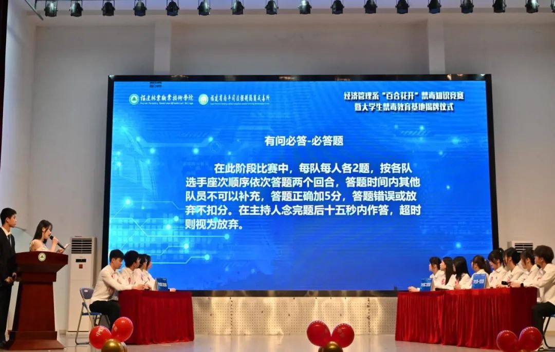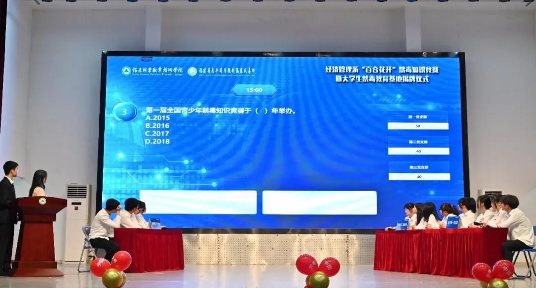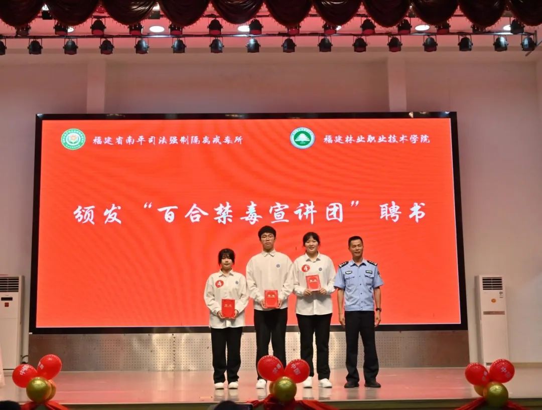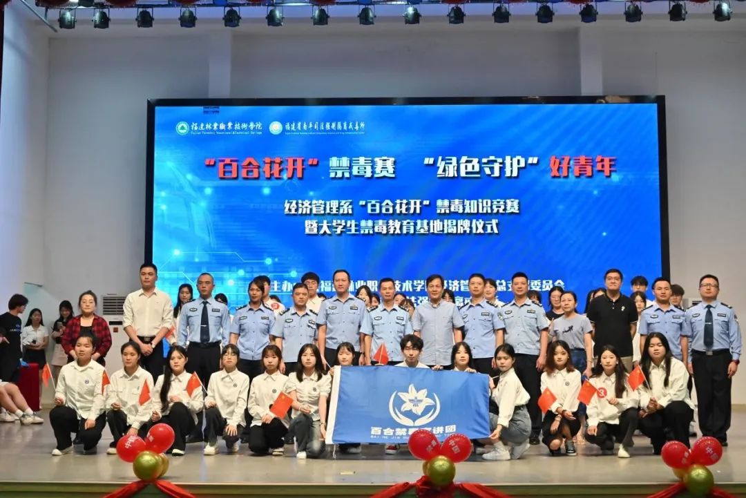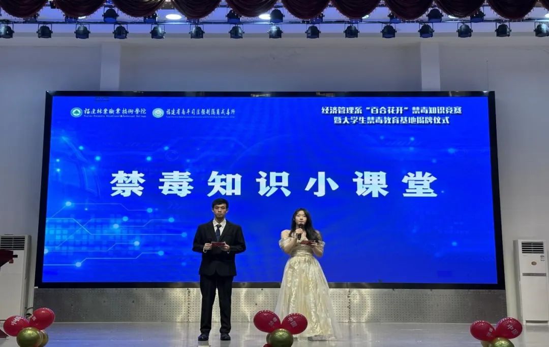 本网讯 为加深广大师生对禁毒知识的了解,强化识毒、防毒、拒毒能力,提升禁毒意识,创新禁毒宣传形式,营造良好禁毒宣传氛围,助力建设“绿色无毒校园”,2024年6月13日晚,学院经济管理系党总支与福建省南平司法强制隔离戒毒所,在天麟校区礼堂联合开展以“‘百合花开’禁毒赛‘绿色守’好青年”为主题的禁毒知识竞赛暨大学生禁毒教育基地揭牌仪式。院党委委员、副院长黄晖,南平司法强制隔离戒毒所党委委员、副所长、三级高级警长陈国顺,院安全保卫处处长胡宗焕,南平司法强制隔离戒毒所教育科科长陈永旺、管理科科长林海、回归指导大队政治教导员余建清,延平区禁毒大队教导员曾华建,南平市中级人民法院陈立伟,学院经济管理系主任林文胜、党总支副书记(主持工作)王昉、师生代表共计400余人参加本次活动。