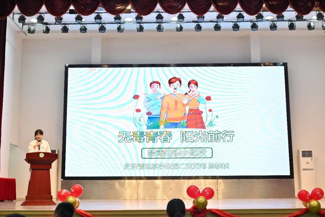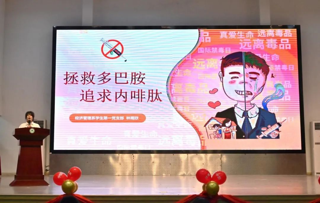 在第二环节的禁毒知识小课堂中,每个党支部派出一位参赛选手,分别以《互相关爱,共享生命》、《拯救多巴胺,追求内啡肽》、《珍爱生命,拒绝毒品》为主题进行演讲。他们的演讲思维敏捷,用词精准,用微视频、现场互动和一个个鲜活饱满的案例,展现出他们对于禁毒知识的自我见解与学识,让观众对“禁毒”有了更深的体会,以更加直观的方式感受毒品的危害,坚定了防毒、拒毒的决心。
