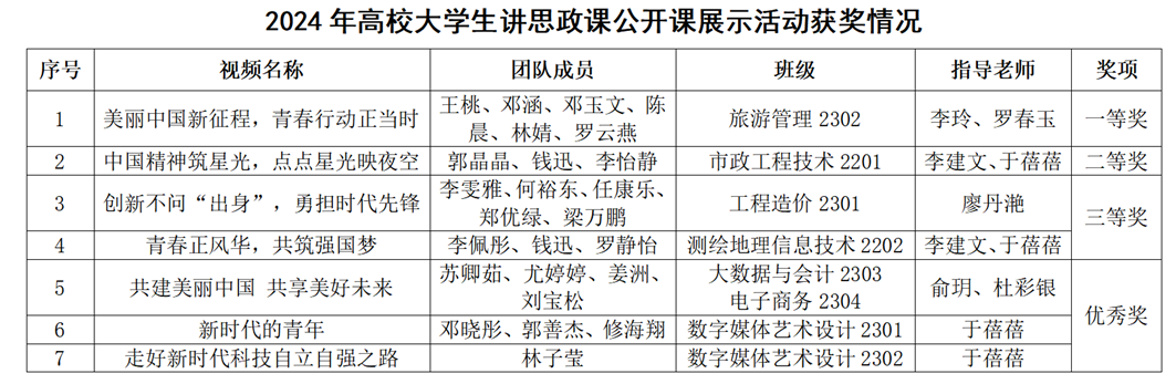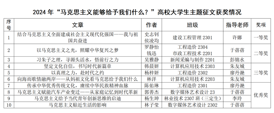 本网讯 为坚持不懈用习近平新时代中国特色社会主义思想铸魂育人,充分调动大学生学习思政课的积极性、主动性和创造性,展现新时代大学生的马克思主义理论素养和精神风貌,2024年3月-6月,学院马克思主义学院组织开展了2024年“马克思主义能够给予我们什么”高校大学生主题征文和微演讲活动、高校大学生讲思政课公开课展示活动、“我心中的思政课”高校大学生微电影展示等习近平新时代中国特色社会主义思想大学习领航计划系列主题活动。活动从初赛到决赛,历时三个月,全院师生积极响应,共收到数百余件作品。经评审,各项活动获奖情况公布如下。