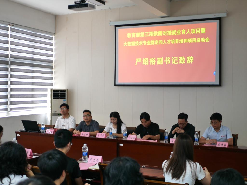 院党委副书记严绍裕在讲话中指出供需对接就业育人项目由教育部搭建平台,面向各类企业、事业单位和行业协会征集项目,旨在组织高校与发布项目用人单位开展供需对接,帮助用人单位培养和招聘更多实用型、复合型和紧缺型人才,促进毕业生更加充分更高质量就业。学院携手福建金创利信息科技有限公司实施供需对接就业育人项目,开展大数据技术专业群定向人才培养培训,围绕大数据技术专业群产业学院、毕业生职业生涯规划、职业导师指导、就业实习基地建设、毕业生供需信息推广等进行深度融合,提升校企合作的深度和广度,为毕业生高质量就业创造条件。