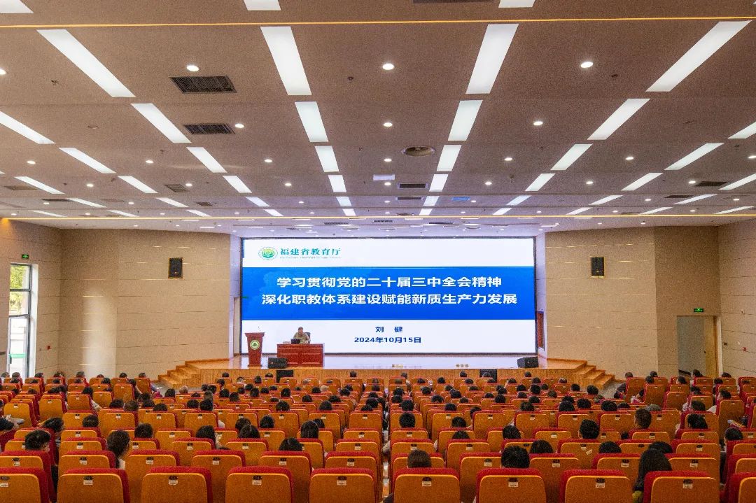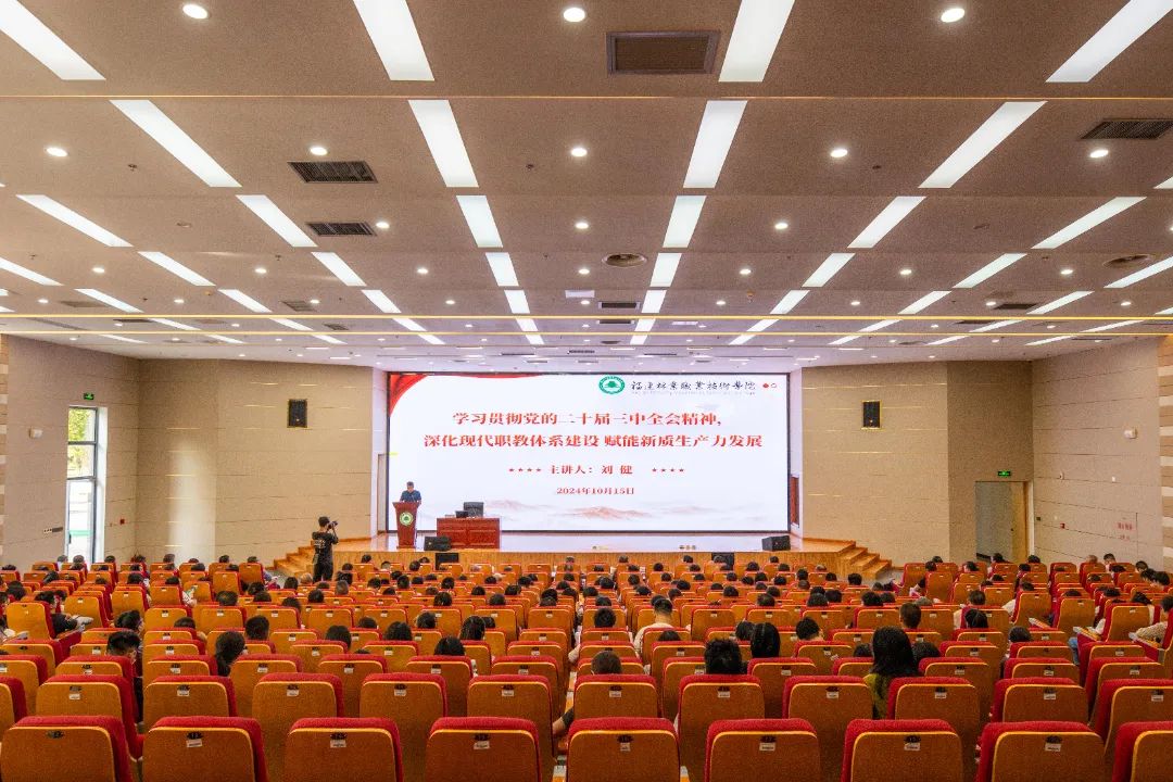 本网讯 为进一步深入学习贯彻党的二十届三中全会精神和全国教育大会精神,深刻认识教育强国的重要战略意义,准确把握现代职业教育体系建设改革新任务新要求,10月15日下午,学院天麟大讲堂特邀福建省政协教科卫体委员会副主任,原福建省教育工委委员、省教育厅党组成员、副厅长(正厅长级)刘健教授为学院全体教师党员作题为《学习贯彻党的二十届三中全会精神,深化现代职教体系建设赋能新质生产力发展》专题辅导讲座。院党委书记陈建辉主持讲座。