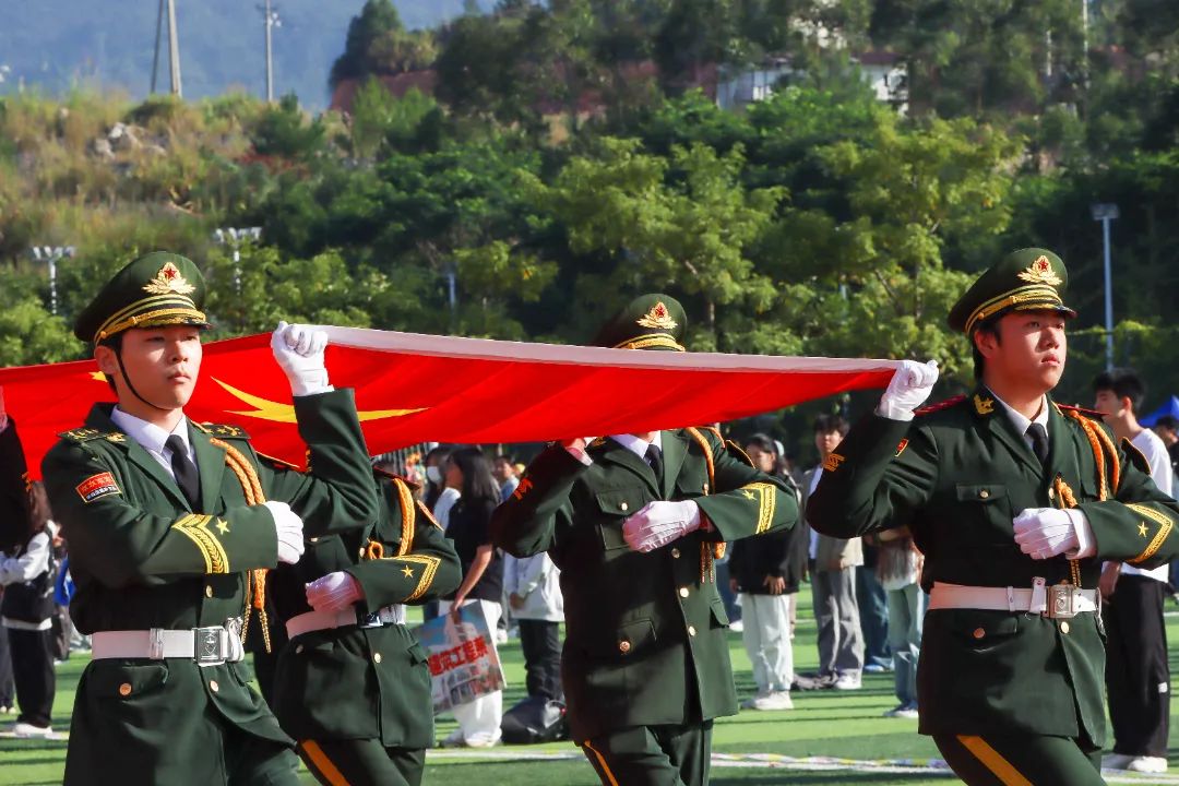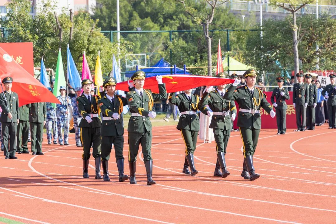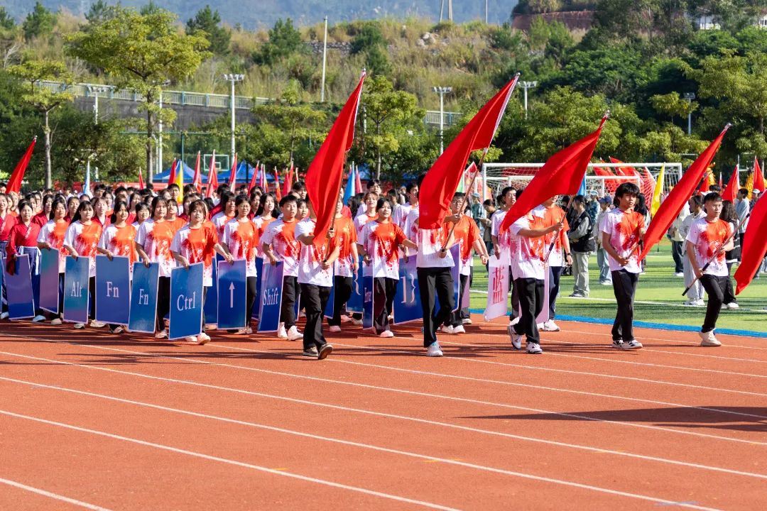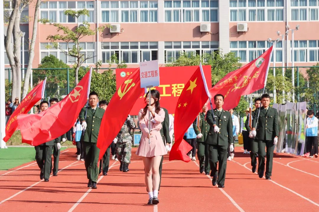 激昂的乐曲奏响,全体师生满心憧憬,翘首以盼,静待各方阵的精彩亮相。伴随着雄壮的《运动员进行曲》,由我院退伍军人组成的军鹰协会成员擎着庄严的五星红旗步入田径场,他们着装整齐,目光如炬;迈着铿锵有力的步伐,青春的风采与五星红旗交相辉映。承载天麟精神与林职校训的校旗和第35届运动会会标在万众瞩目之下缓缓入场,展天麟之精神,扬林职之风采。 八十面彩旗旗迎风飘扬,活力四射,青春洋溢。林职院的青春色彩肆意挥洒,全场氛围推向高潮,激情澎湃的运动会拉开序幕。