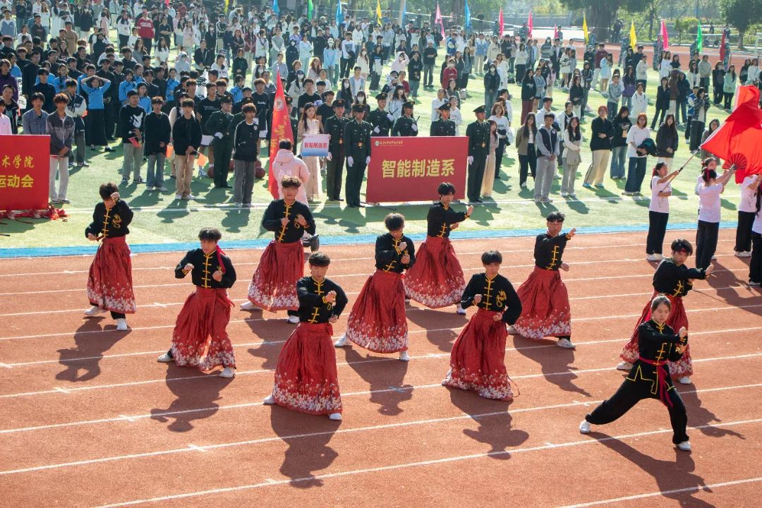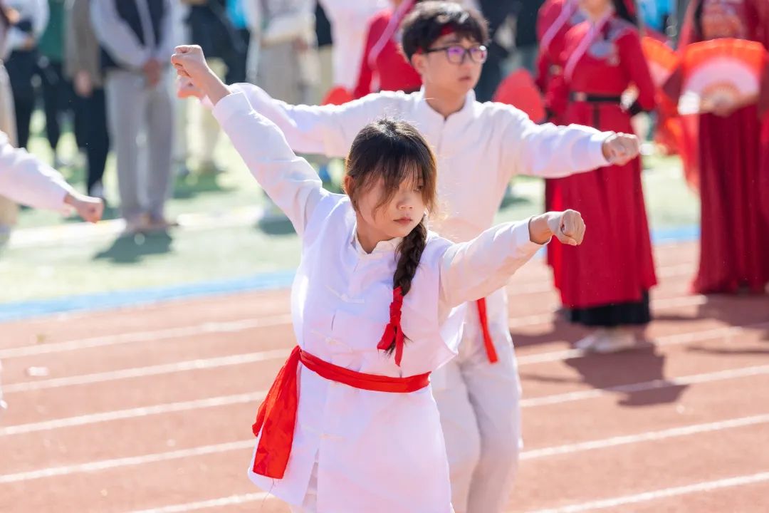 鲜艳红旗迎风飘扬,园林学子的身影轻盈跃动,舞扇轻展起舞翩翩,舞枪弄棒寒光乍现,转瞬之间都蕴含着东方美学的极致韵味。