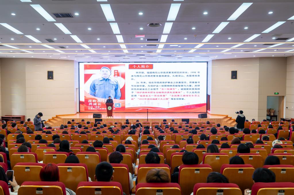 在劳模进校园暨“先进模范上讲台”大思政课中,福建梅花山华南虎繁育研究所所长林开雄带来题为《虎园虎仔虎医生 26 载助虎生威路》的宣讲。林开雄所长生动讲述了自己26年来,白手起家,扎根深山,克服艰苦条件,将梅花山华南虎繁育研究打造成了生物多样性保护的生态样板的动人事迹。他在华南虎保护事业上执着坚守,用青春书写壮丽华章,为保护这一珍稀物种贡献智慧与力量,展现了他爱岗敬业、不畏艰难、不懈探索的劳模精神。
