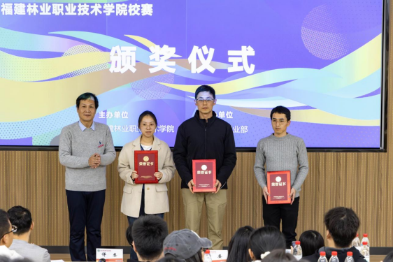 就业创业指导科科长黄庆斌为铜奖项目获奖者颁奖