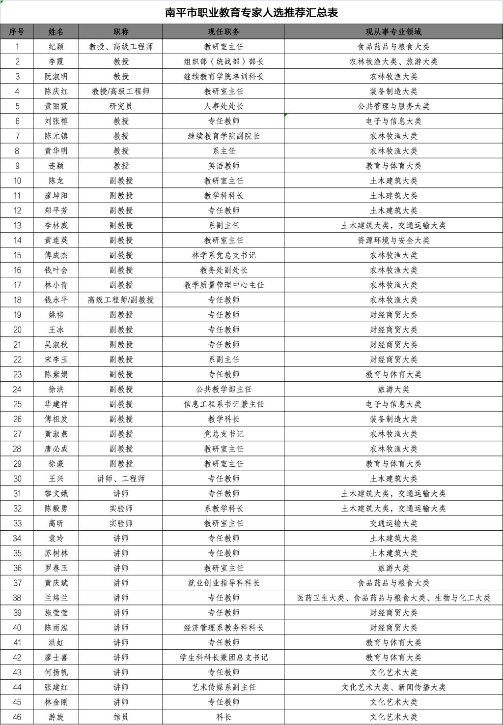 本网讯 为充分发挥南平市职业教育专家在职业教育发展中的引领指导作用,南平市决定从职业院校从事专业教学或职业教育研究的人员、中等职业学校专业(学科)带头人或骨干教师、职业教育教研机构专业技术人员中遴选专家组建南平市职业教育专家库,参与全市职业院校学校建设、检查评估、专业建设、教材建设、教学诊断,课题和论文、骨干教师、教学名师、专业(学科)带头人及名师工作室评选、职业院校技能大赛评判等工作。南平市域高职院校有83位专家入选,我院共有46位教师入选。入选的专家将充分发挥专业特长和优势,认真开展职业教育教学研究,积极配合教育行政部门做好各项工作,为南平市职业教育高质量发展做出贡献。