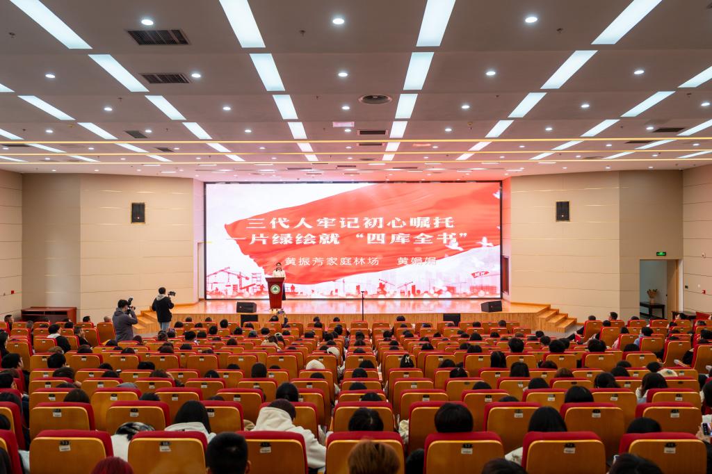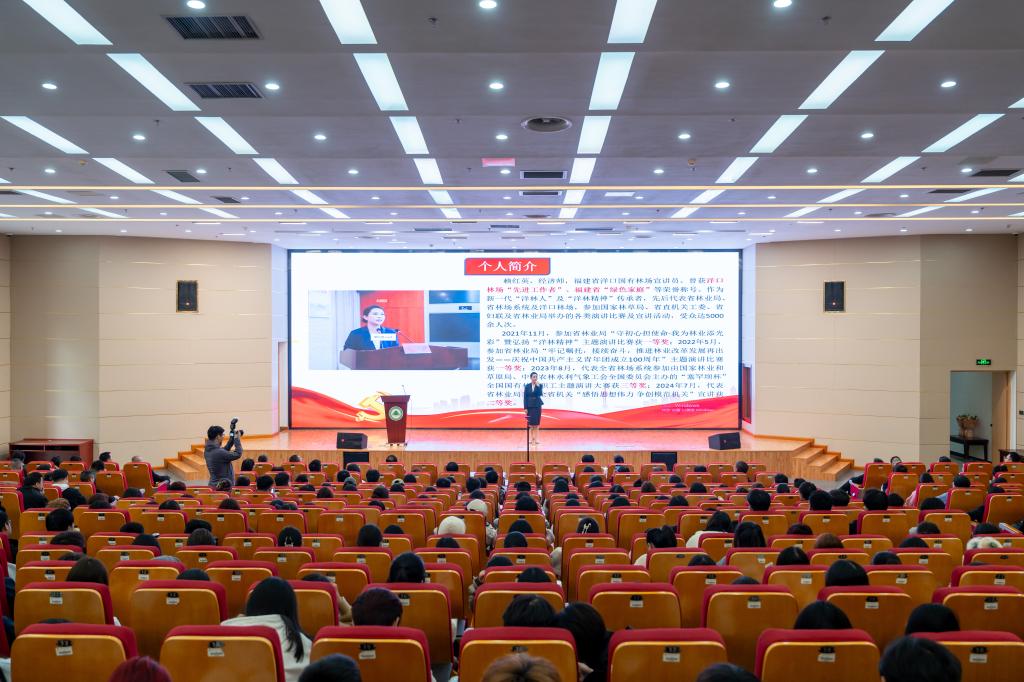 周宁县“黄振芳家庭林场先进事迹”宣讲员黄娟娟深情讲述了《三代人牢记初心嘱托 一片绿绘就“四库全书”》的故事。“造林大王”黄振芳的家庭林场三棵树三代人把青春交付给青山、践行森林“四库”重要理念,带领与会师生穿越时间的长河,见证三代林业人如何以实际行动践行绿水青山就是金山银山的理念,守护好我们共有的绿色家园。