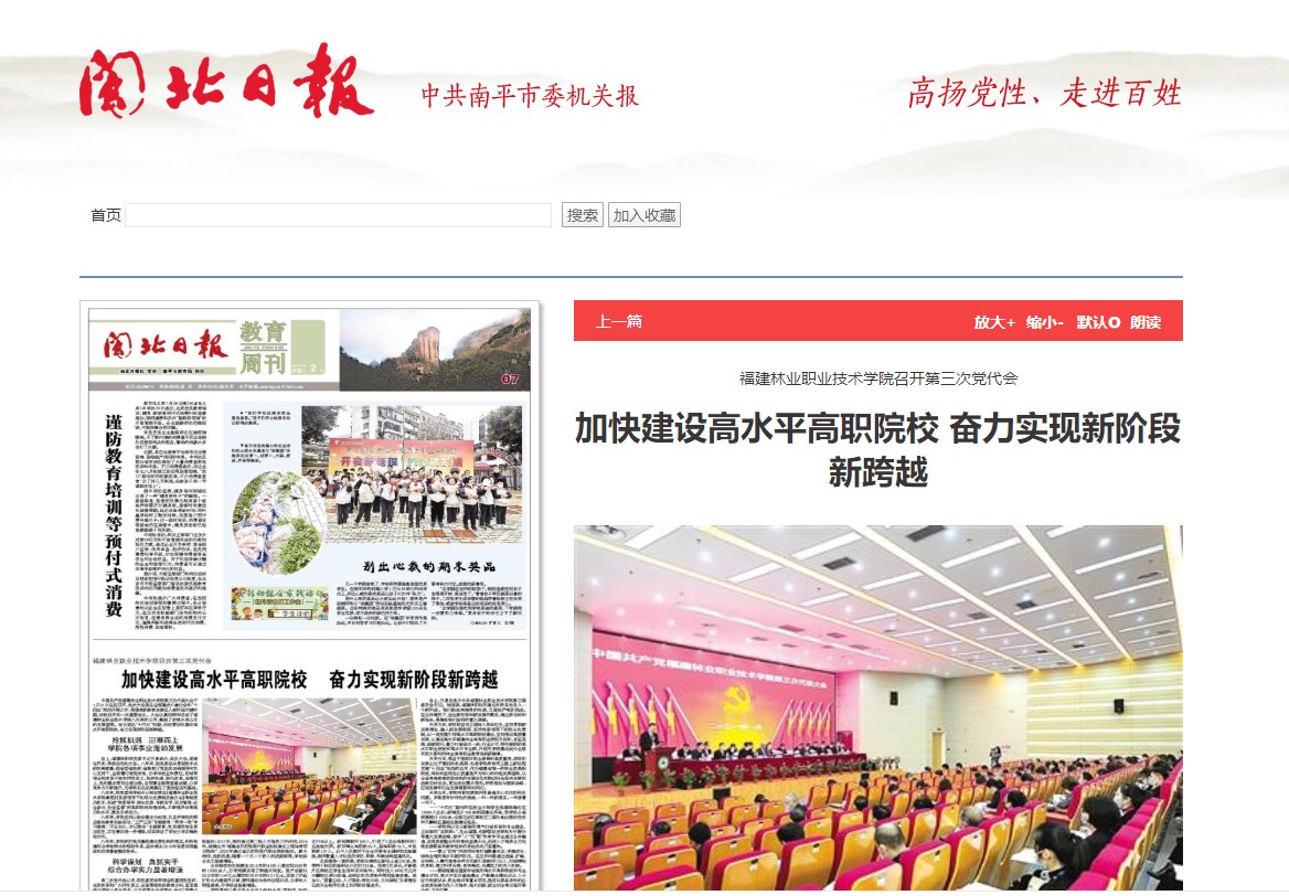 中国共产党福建林业职业技术学院第三次代表大会于1月21日在延召开,此次大会是在全面建成小康社会和“十四五”规划开局之年,我国高职教育发展迈入新阶段关键时期,该校召开的一次重要会议。大会认真回顾和总结了福建林业职业技术学院八年来的工作,擘画了该校未来五年的发展蓝图。会议提出“十四五”时期,该校要加快建设高水平高职院校,奋力实现新阶段新跨越。
