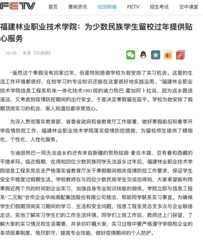 与迪丽热巴一同无法返乡的还有来自新疆的努热姑丽·麦合木提、豆有春和西藏的平措卓玛。临近假期,在得知四位少数民族同学无法返乡过年后,福建林业职业技术学院信息工程系党总支严格落实省教育厅关于寒假期间相关疫情防控工作要求,保证学生安全平稳度过假期生活。学校教师在与四位少数民族学生交谈后得知,大家希望能利用寒假近两个月的时间到企业实习,加强自身专业知识技能的锻炼。学院立即与信息工程系“二元制”合作企业华闽南配集团股份有限公司接洽,帮助同学联系实习事宜。为确保学生们假期顶岗实习期间的学习、生活和安全问题,信息工程系党总支多次与企业联络走访,实地了解实习学生们的工作生活环境。同学们上岗工作后,教师还上门探望,了解大家的实习情况和生活需要,并亲切叮嘱大家,实习过程中要严格遵守学院和企业的各项规章制度,恪尽职守,提高专业技能,做好疫情期间的个人防护。