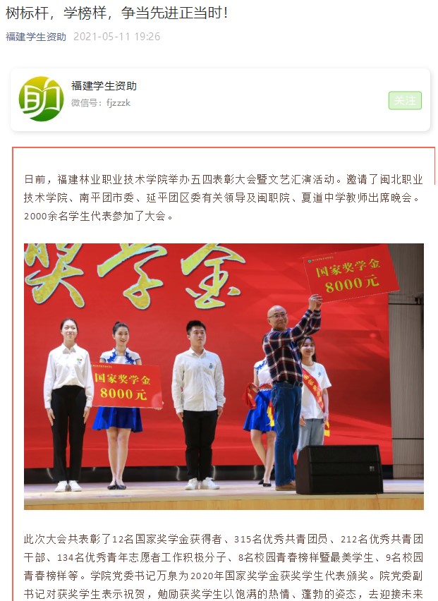 日前,福建林业职业技术学院举办五四表彰大会暨文艺汇演活动。邀请了闽北职业技术学院、南平团市委、延平团区委有关领导及闽职院、夏道中学教师出席晚会。2000余名学生代表参加了大会。