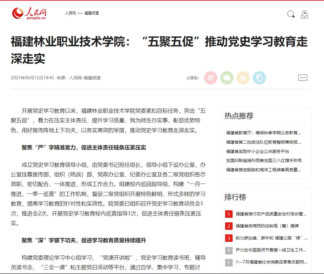 开展党史学习教育以来,福建林业职业技术学院党委紧扣目标任务,突出“五聚五促”,着力在压实主体责任、提升学习质量、我为师生办实事、彰显优势特色、用好宣传阵地上下功夫,以务实高效的举措,推动党史学习教育走深走实。