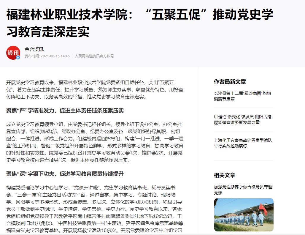 开展党史学习教育以来,福建林业职业技术学院党委紧扣目标任务,突出“五聚五促”,着力在压实主体责任、提升学习质量、我为师生办实事、彰显优势特色、用好宣传阵地上下功夫,以务实高效的举措,推动党史学习教育走深走实。