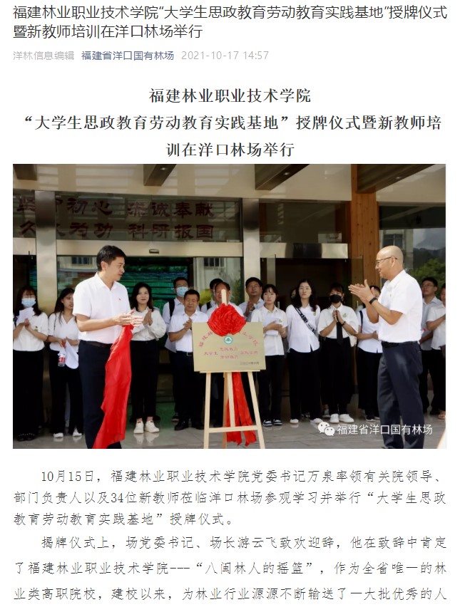 福建林业职业技术学院“大学生思政教育劳动教育实践基地”授牌仪式暨新教师培训在洋口林场举行