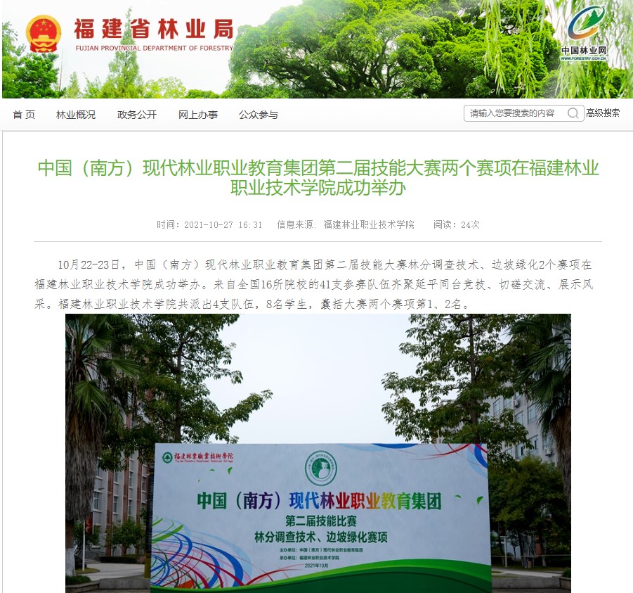 10月22-23日,中国(南方)现代林业职业教育集团第二届技能大赛林分调查技术、边坡绿化2个赛项在福建林业职业技术学院成功举办。来自全国16所院校的41支参赛队伍齐聚延平同台竞技、切磋交流、展示风采。福建林业职业技术学院共派出4支队伍,8名学生,囊括大赛两个赛项第1、2名。