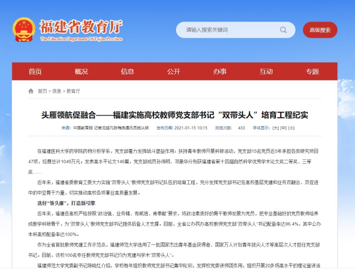 “双带头人”教师党支部书记,既要政治强,又要业务精。福建坚持围绕中心抓党建、抓好党建促发展,唱好“基本功”,推动党建工作与教学科研工作相互结合、有机融入,实现党务和业务同向发力、联动提升,破除党建与教学科研相脱离的“两张皮”现象以及党建工作被虚化问题,把党组织的领导力和组织力转化为推进课堂教学、科研立项、组建团队、海外研修等工作强大动力,不断提高教学科研水平。