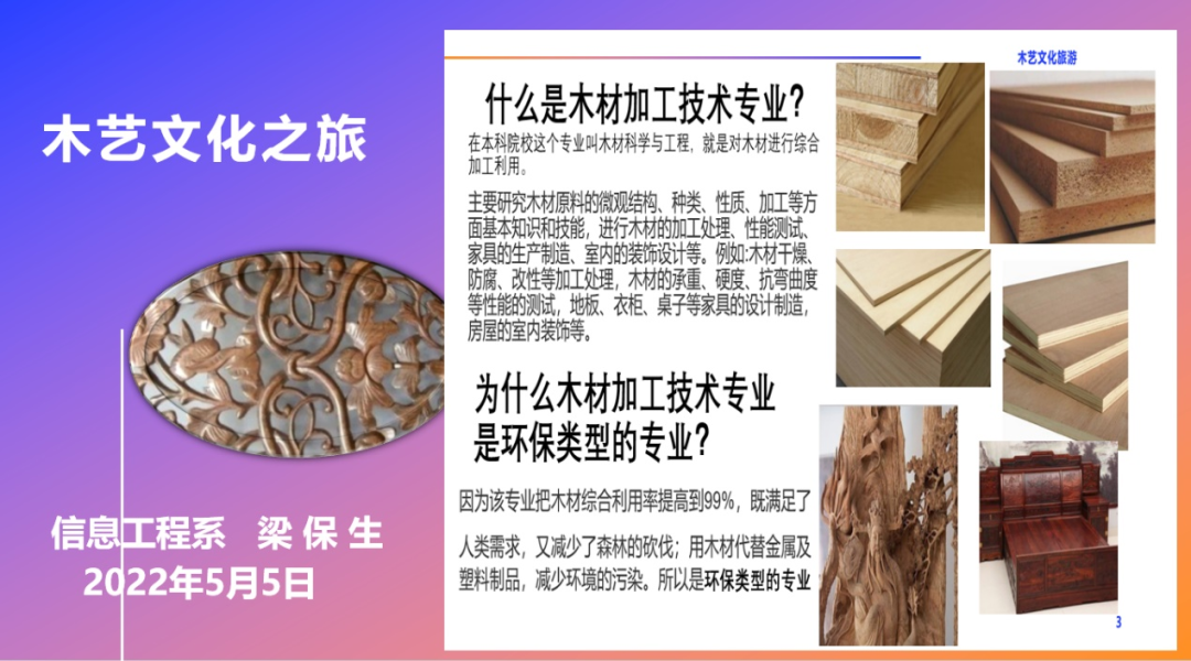 民盟南平市监督委委员、福建林业职业技术学院支部主委梁保生副教授,结合自身在木艺雕刻,数控加工,家具设计领域的专业技术特长,首先从“木材加工专业为什么是为环保做贡献的专业”问题入手,先后做了专业介绍,生活案例介绍,让70位新入职辅导员感受到木材加工专业与我们的生活需求息息相关。