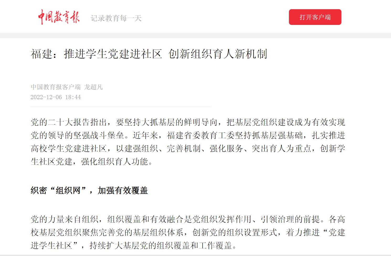 党的二十大报告指出,要坚持大抓基层的鲜明导向,把基层党组织建设成为有效实现党的领导的坚强战斗堡垒。近年来,福建省委教育工委坚持抓基层强基础,扎实推进高校学生党建进社区,以建强组织、完善机制、强化服务、突出育人为重点,创新学生社区党建,强化组织育人功能。
