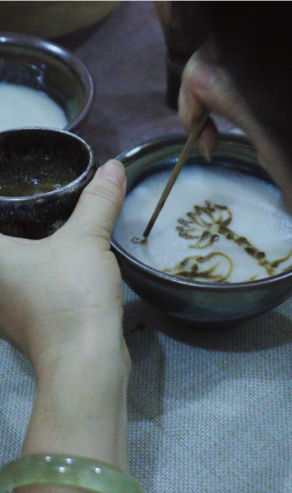 随着一曲“高山流水”的响起,赵老师焚香静气、插花赋雅,展示了仿宋点茶表演,一套行云流水的点茶手法,令人无不赞叹。点茶完成后,汤面上幻变出各种图样,或花鸟鱼虫,或山水云雾,犹如一幅幅水墨画,茶中有山水、山水中有茶。