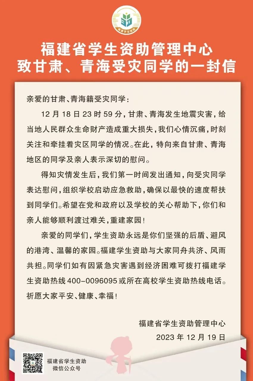 据福建省学生资助管理中心初步统计,截至12月20日,全省有38所学校130名学生家庭受到地震灾害影响(含2名亲人受轻伤的学生)。其中:甘肃生源115人,青海生源12人,新疆生源3人。受灾情况主要为家庭房屋受损、家具家电破坏等。目前所有受灾学生都已纳入应急救助范围,学校通过发放应急救助资金、寒假返乡补助、减免学费等方式帮助受灾学生。