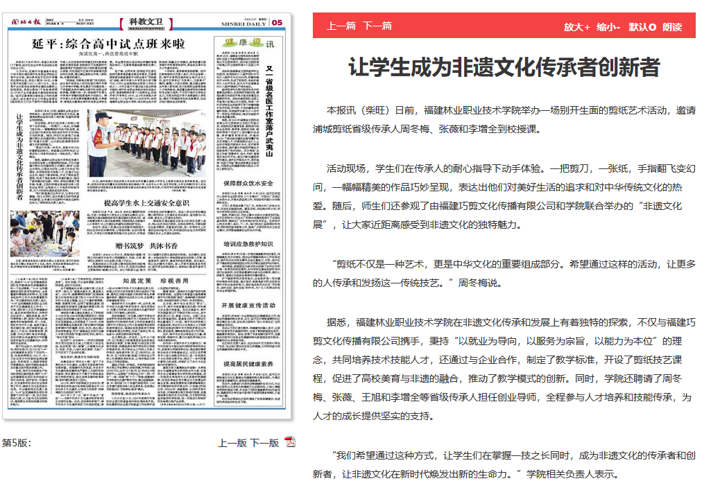 据悉,福建林业职业技术学院在非遗文化传承和发展上有着独特的探索,不仅与福建巧剪文化传播有限公司携手,秉持“以就业为导向,以服务为宗旨,以能力为本位”的理念,共同培养技术技能人才,还通过与企业合作,制定了教学标准,开设了剪纸技艺课程,促进了高校美育与非遗的融合,推动了教学模式的创新。同时,学院还聘请了周冬梅、张薇、王旭和李增全等省级传承人担任创业导师,全程参与人才培养和技能传承,为人才的成长提供坚实的支持。