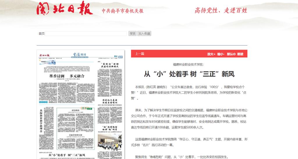 本报讯(陈红英 谢晓东)“公交车直达宿舍,出行体验‘100分’,我要给学校点个赞!”近日,福建林业职业技术学院大二的学生小林找到院系老师,为学校的新变化“点赞”。