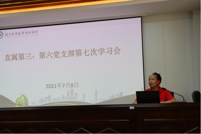 本网讯 7月8日,学院直属第三、第六党支部联合组织开展第七次学习会。直属第六党支部书记洪福兴组织全体党员集体学习习近平总书记在庆祝中国共产党成立100周年大会上的重要讲话精神及中央相关学习通知、中共中央印发《中国共产党组织工作条例》、中共中央印发《中国共产党党徽党旗条例》、省委十届十二次全会精神、全国“两优一先”获得者事迹、“七一勋章”获得者事迹等。