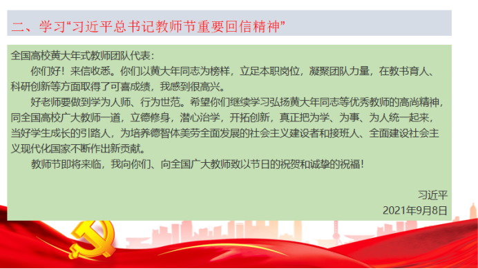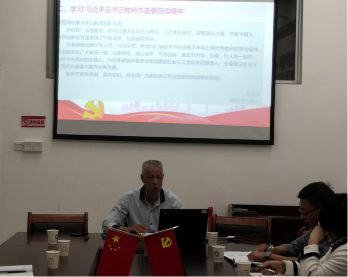 本网讯 10月27日,直属第六党支部组织第十次学习会。学习会上,党支部书记洪福兴带领全体党员集体学习“习近平总书记教师节重要回信精神”、中共中央 国务院印发《深化新时代教育评价改革总体方案》(闽委教育〔2021〕2号)、《中华人民共和国安全生产法》,并开展直属第六党支部党员政治生日活动。随后,组织部(统战部)李霞带领全体党员专题学习《中国共产党章程》。