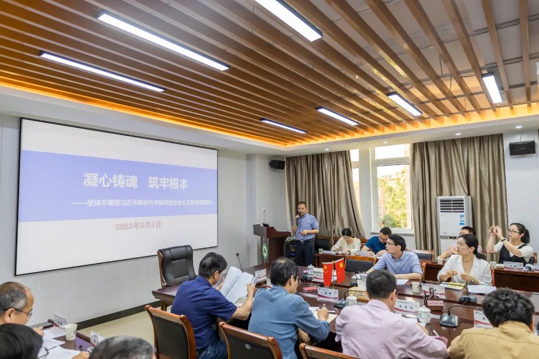 本网讯根据学院主题教育工作安排,5月4日下午,学院在江南校区行政楼第一会议室举行学习贯彻习近平新时代中国特色社会主义思想主题教育读书班第二次学习会,聚焦“凝心铸魂 筑牢根本——坚持不懈用习近平新时代中国特色社会主义思想铸魂育人”专题举行集中学习研讨。院党委书记、主题教育领导小组组长万泉主持学习研讨并讲话。院党委副书记、院长刘文开作专题辅导报告。学院主题教育读书班成员参加学习研讨,李霞、廖世建、黄云玲、蔡敏、郭先根、成榕等同志作重点发言。